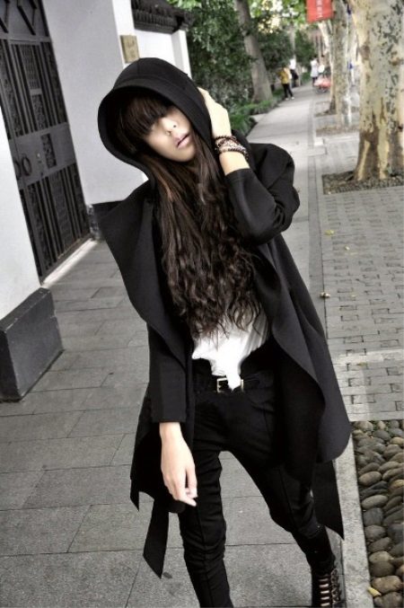 Distinctive features of the mantle are a deeper hood, black color and length below the middle of the thighs, so that it can be called a jacket-raincoat.
