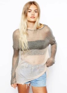 Openwork mesh sweater, knitted of several patterns, with short denim shorts and a laconic black top.