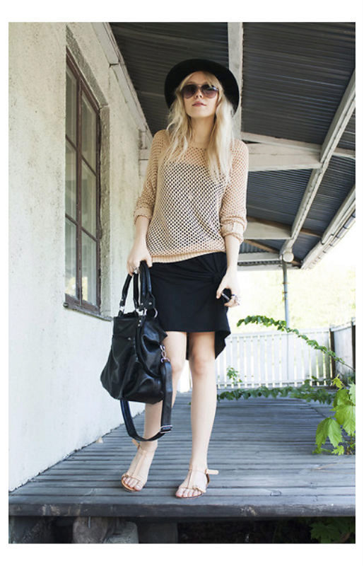 A beige net sweater over a black cocktail dress, combined with flesh-colored sandals, a black hat and a oversized bag.