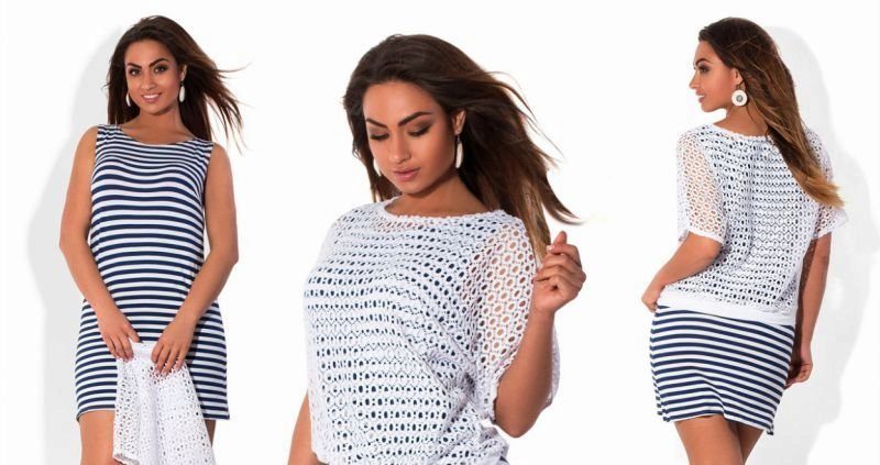 A snow-white sweater-mesh of a free silhouette is combined with a form-fitting dress in a nautical style and graceful wedge sandals.