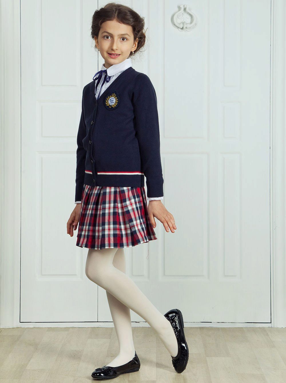 The classic schoolgirl sweater is a straight-cut product with long or short sleeves, as well as a button closure, a zipper or buttons.
