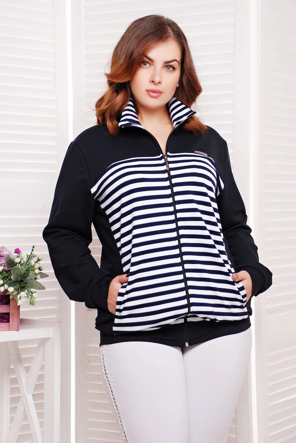 - Shortened jacket. A great option for sports in the hall or on the street. But it is worth remembering that such a length can highlight some imbalances of the figure.