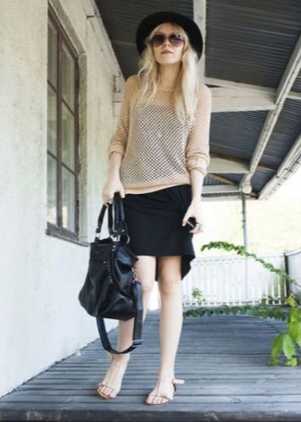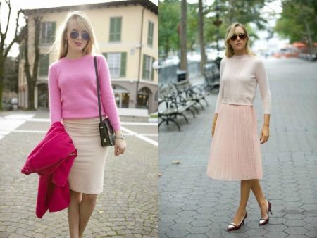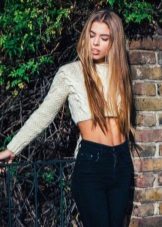 Fashionable short and short sweaters barely cover or do not cover the stomach at all. Naturally, they are only suitable for girls who do not have fat folds in this part of the body. They are usually worn with high-waisted jeans or skirts, and this set looks interesting and stylish.