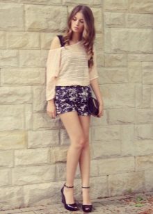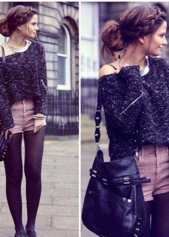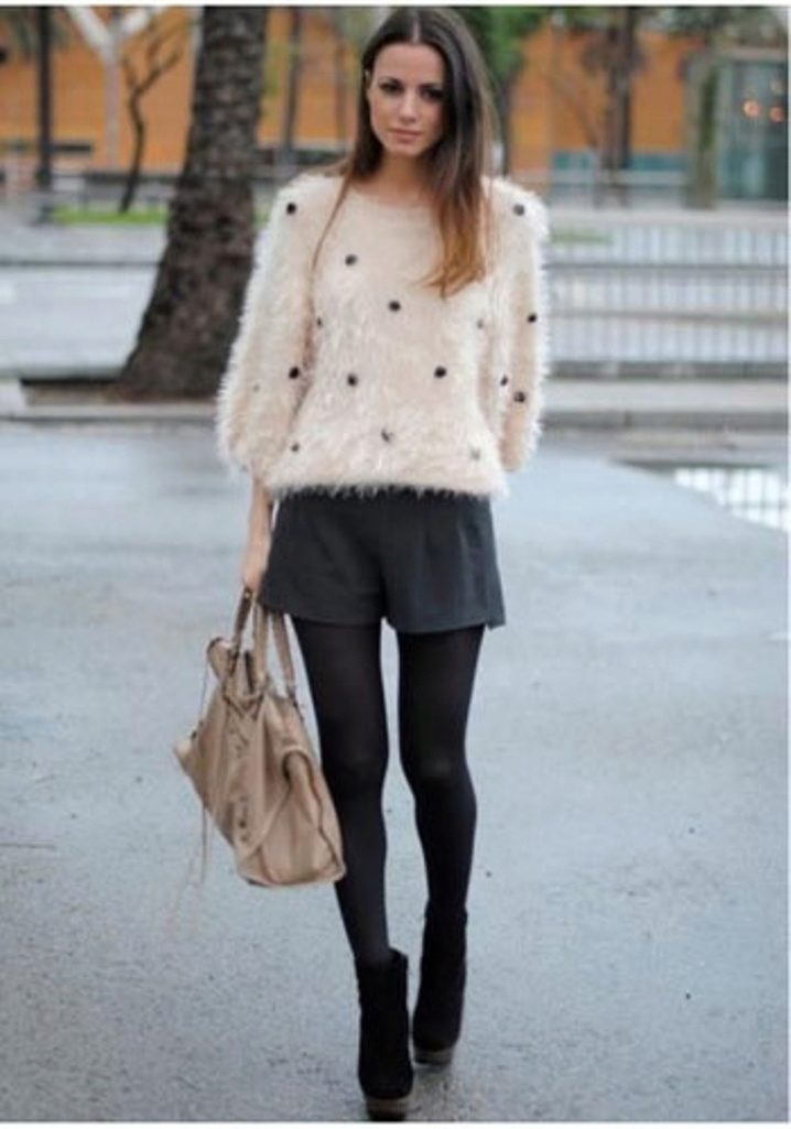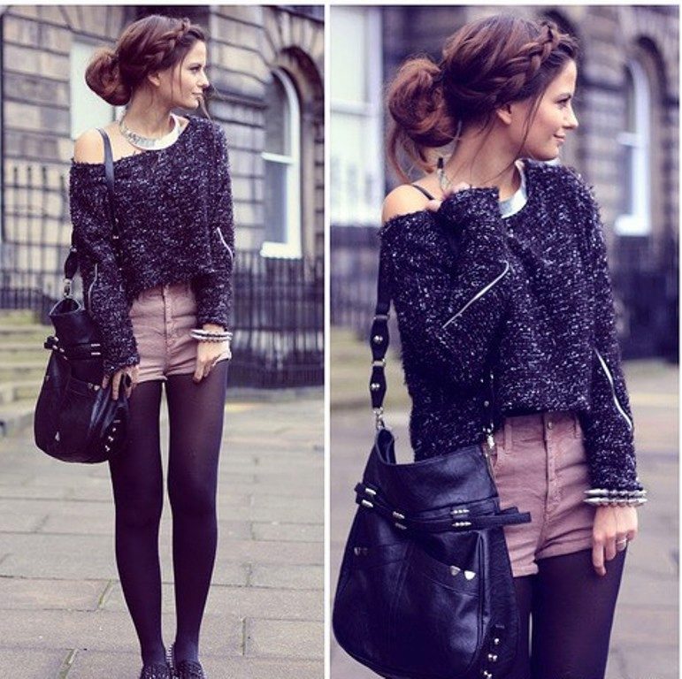 Want to get a sexy casual look? Wear a V-neck blouse over a naked body, combining it with short leather shorts and black tights. Do not forget about ankle boots with high heels and a volume bag.