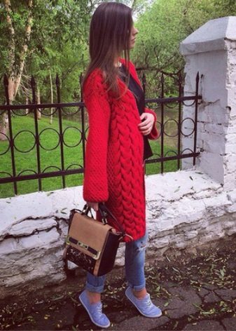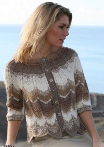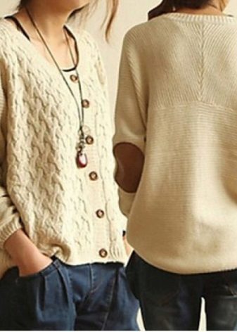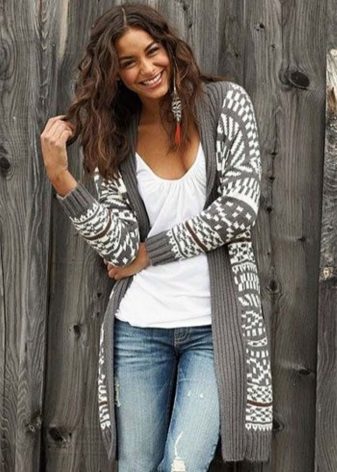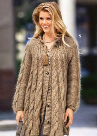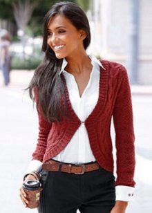 - Cardigan sweater. In a fashion model of sheep wool in natural colors. They can be decorated with geometric patterns and voluminous braids.