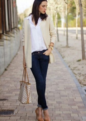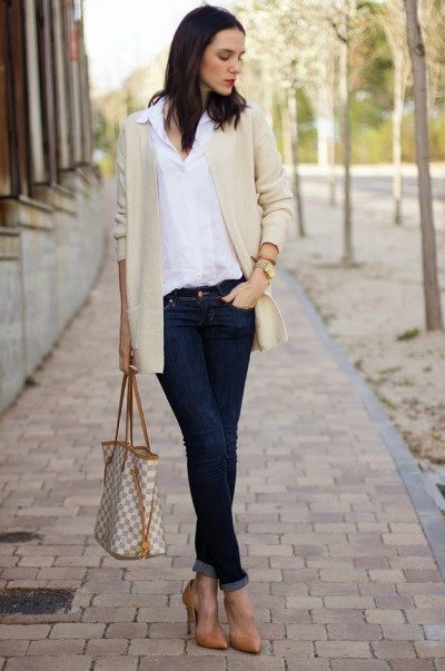 - The combination of trousers or a skirt, a shirt and an elongated cardigan jacket will suit the business image.