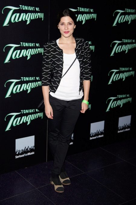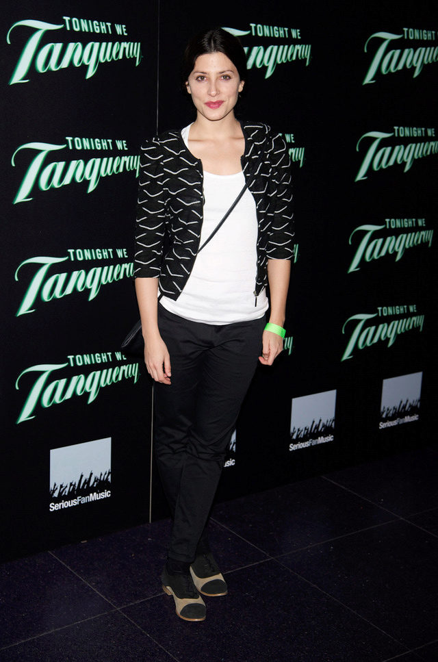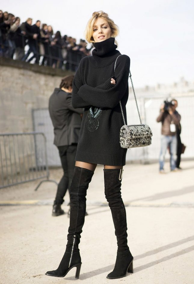 Total black look for the publication does not seem so boring if you put on a short blue blouse made of fine knitwear. Looks very cozy and stylish.