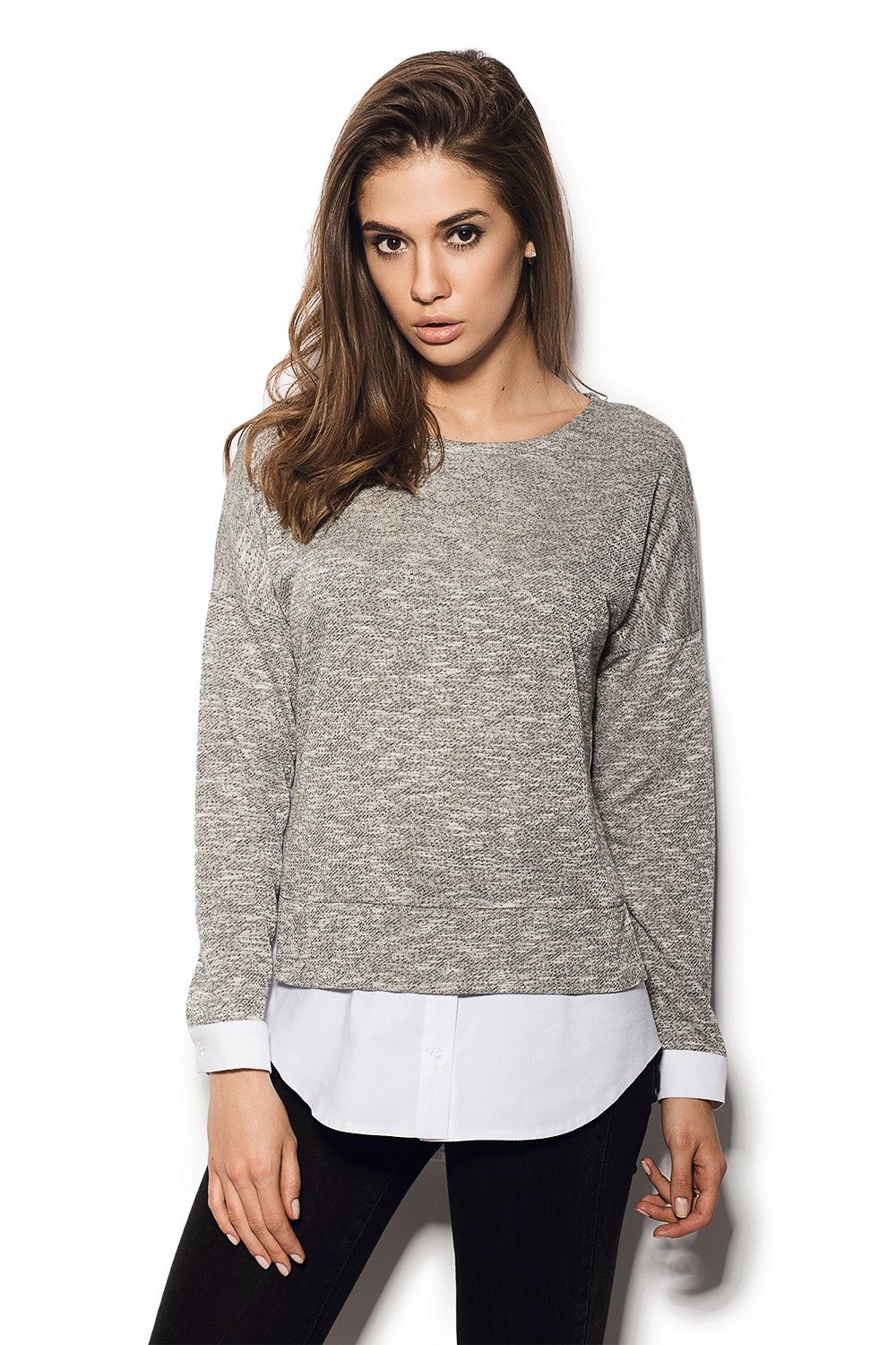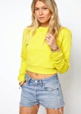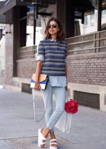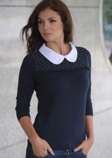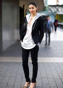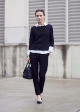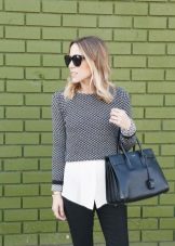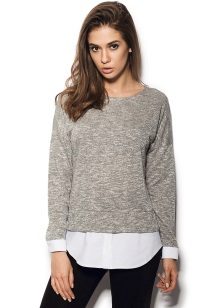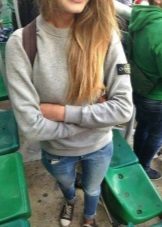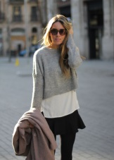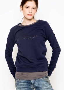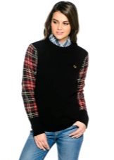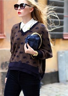- Sweatshirt snag. A feature of this type of sweaters is the imitation of the presence of another item of clothing under it. Most often - shirts. This may be a shirt collar or sleeves peeking out from under such a jacket.