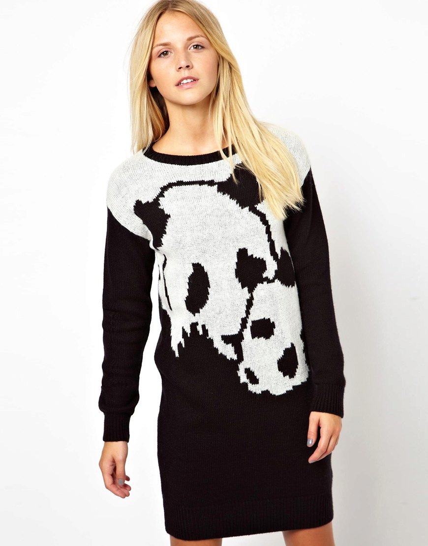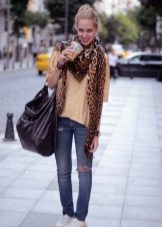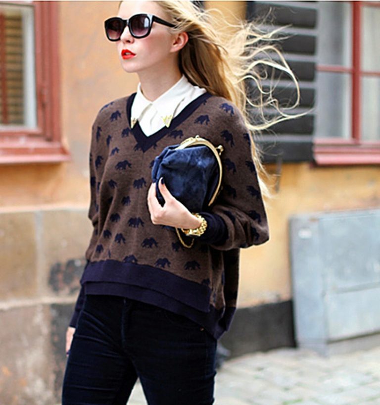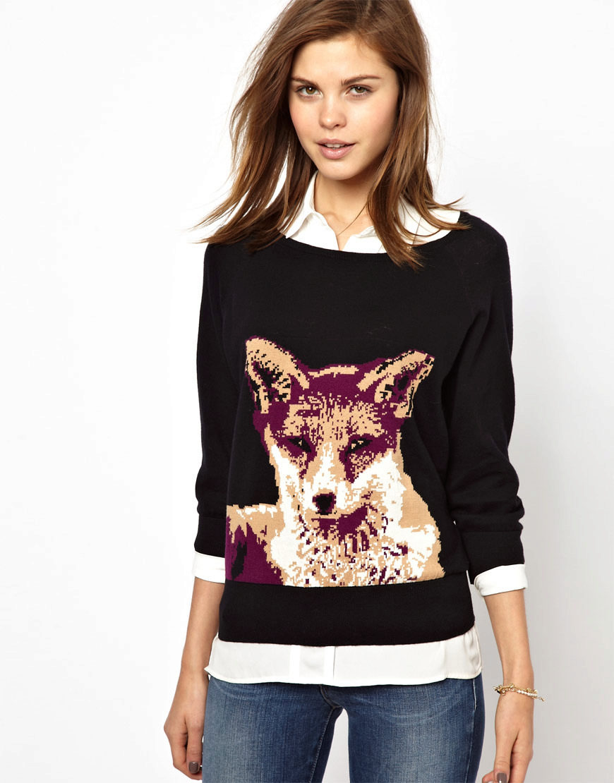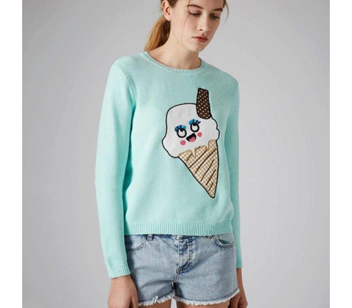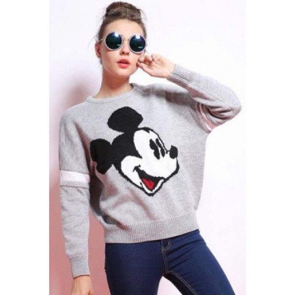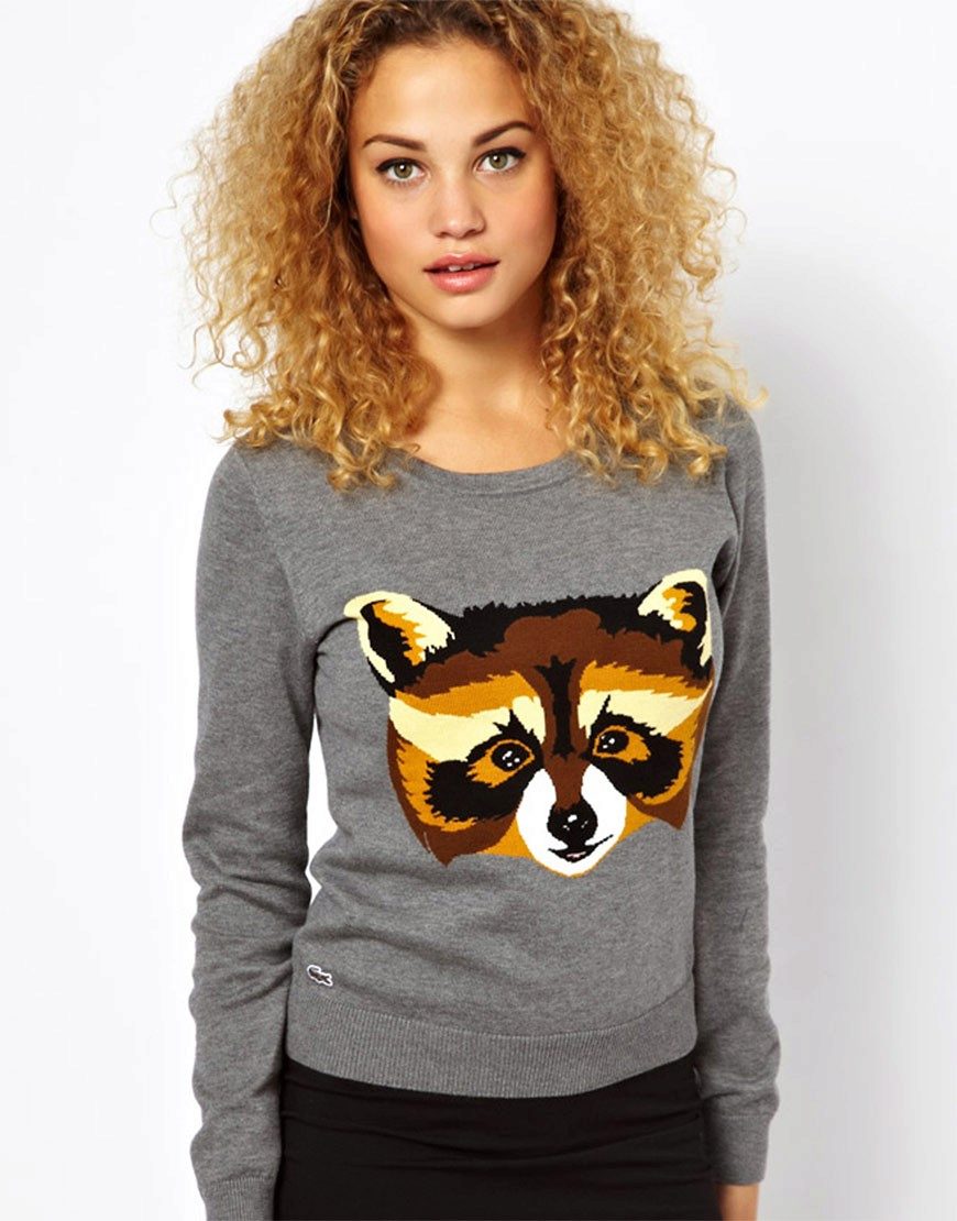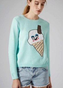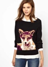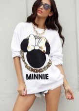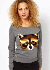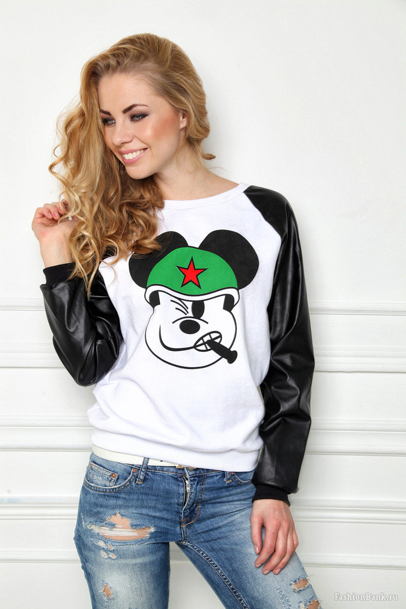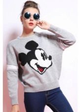 Infantilism inherent in modern trendy blouses, dictates the fashion for cartoon prints. Sweaters and sweatshirts with Mickey Mouse, his girlfriend Minnie, as well as other characters from Disney and other popular cartoons are especially loved by the fair sex. In addition, prints with deer, bears, foxes, raccoons, pandas are also in great demand.