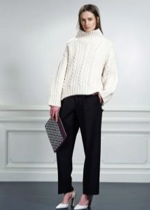 A classic white sweater with a slightly elongated back and trendy braids is a stylish outfit for both business and casual wear.