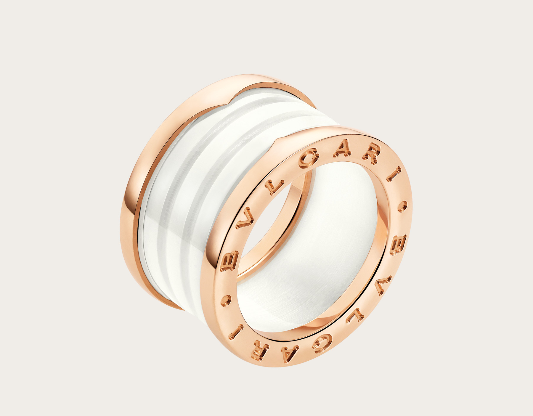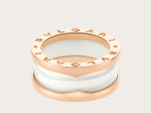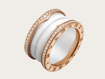 Each model is made on the basis of gold, which is a wide hoop with an extruded center. The ceramic base is complemented by a ceramic, marble, or steel center. In the center of the products is a unique spiral Bvlgari.