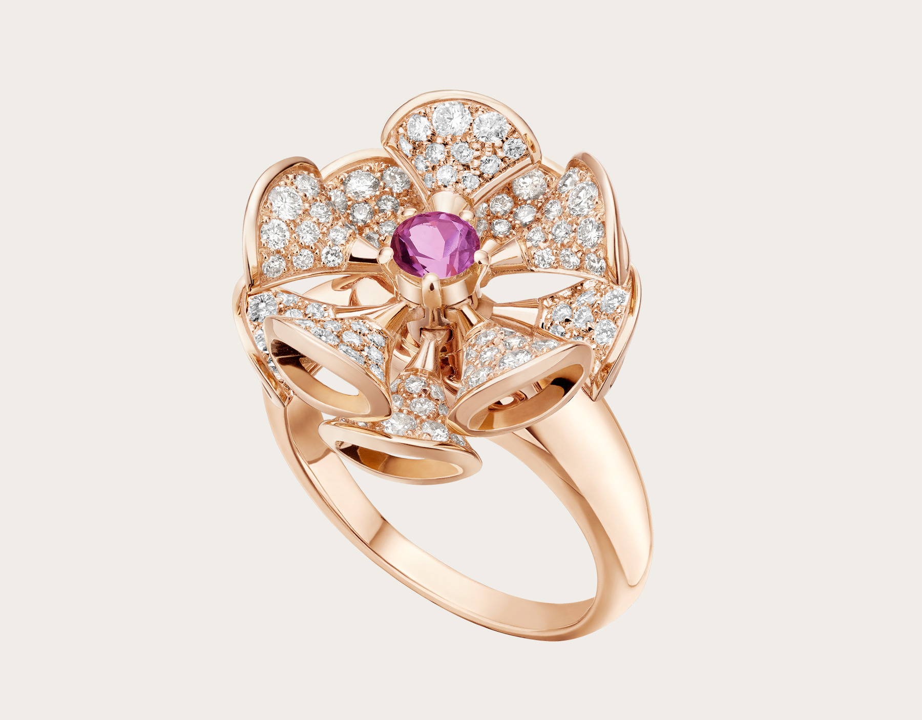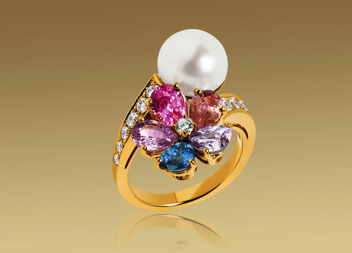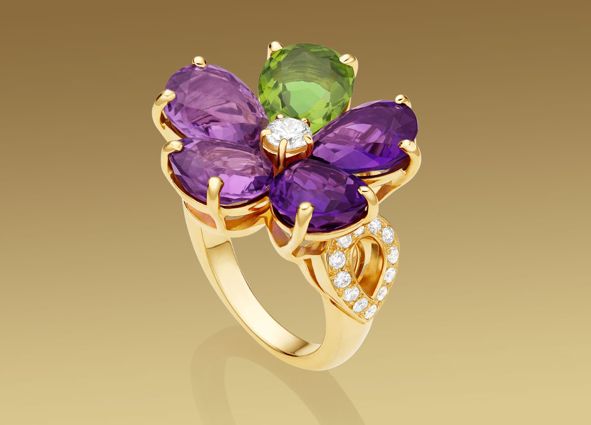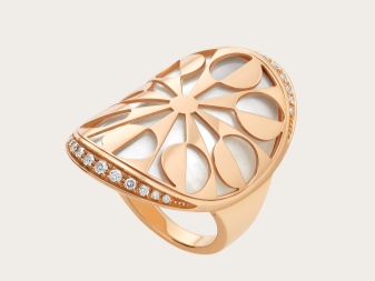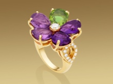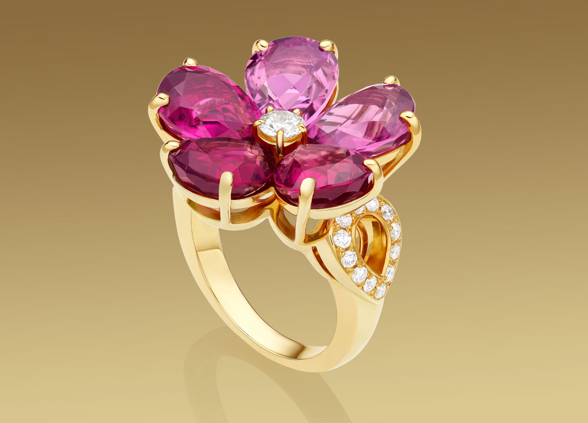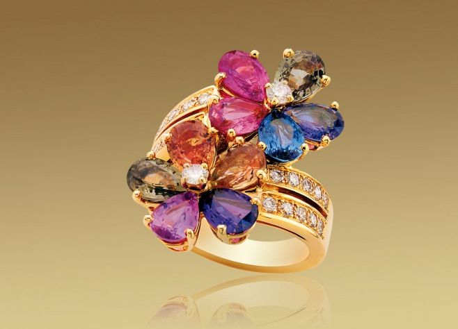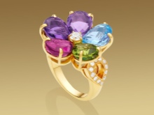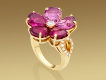 Reflection of the favorite brand of naturalistic motifs. The combinations of stones of various shades and shapes on elegant rings resemble lush and beautiful bouquets of flowers. Mostly pear-shaped stones are used, which imitate individual petals on flowers topped with a diamond core.