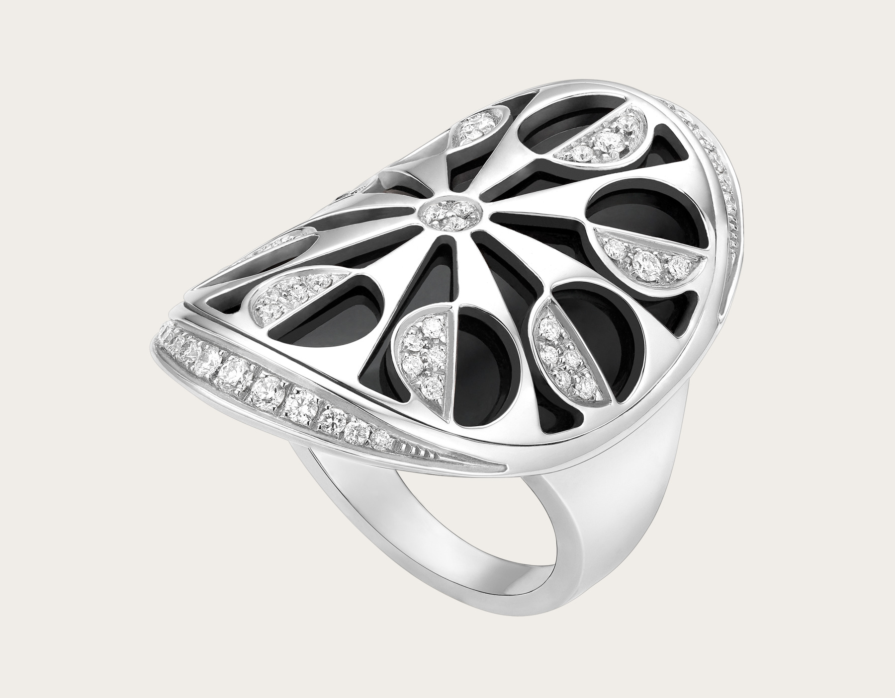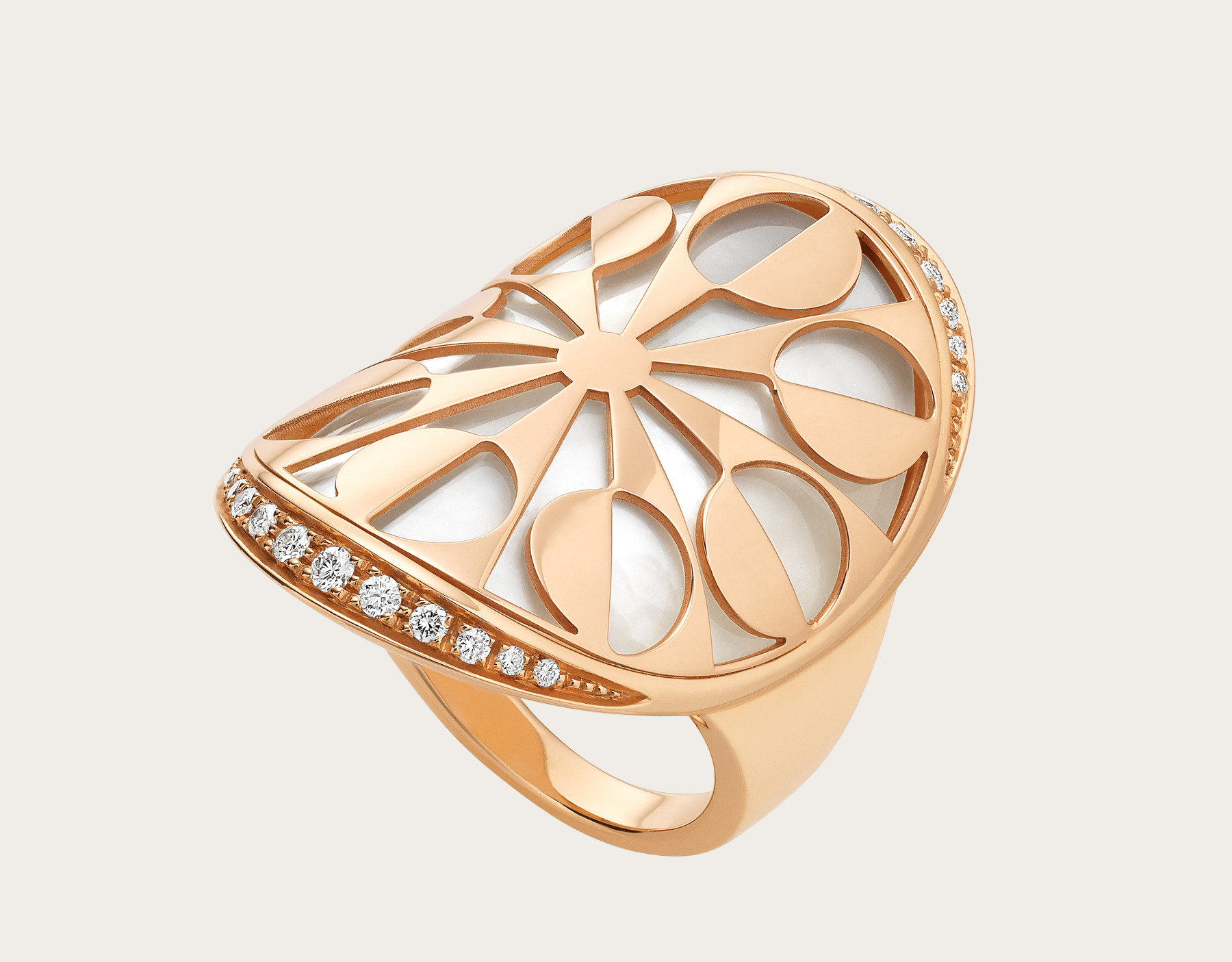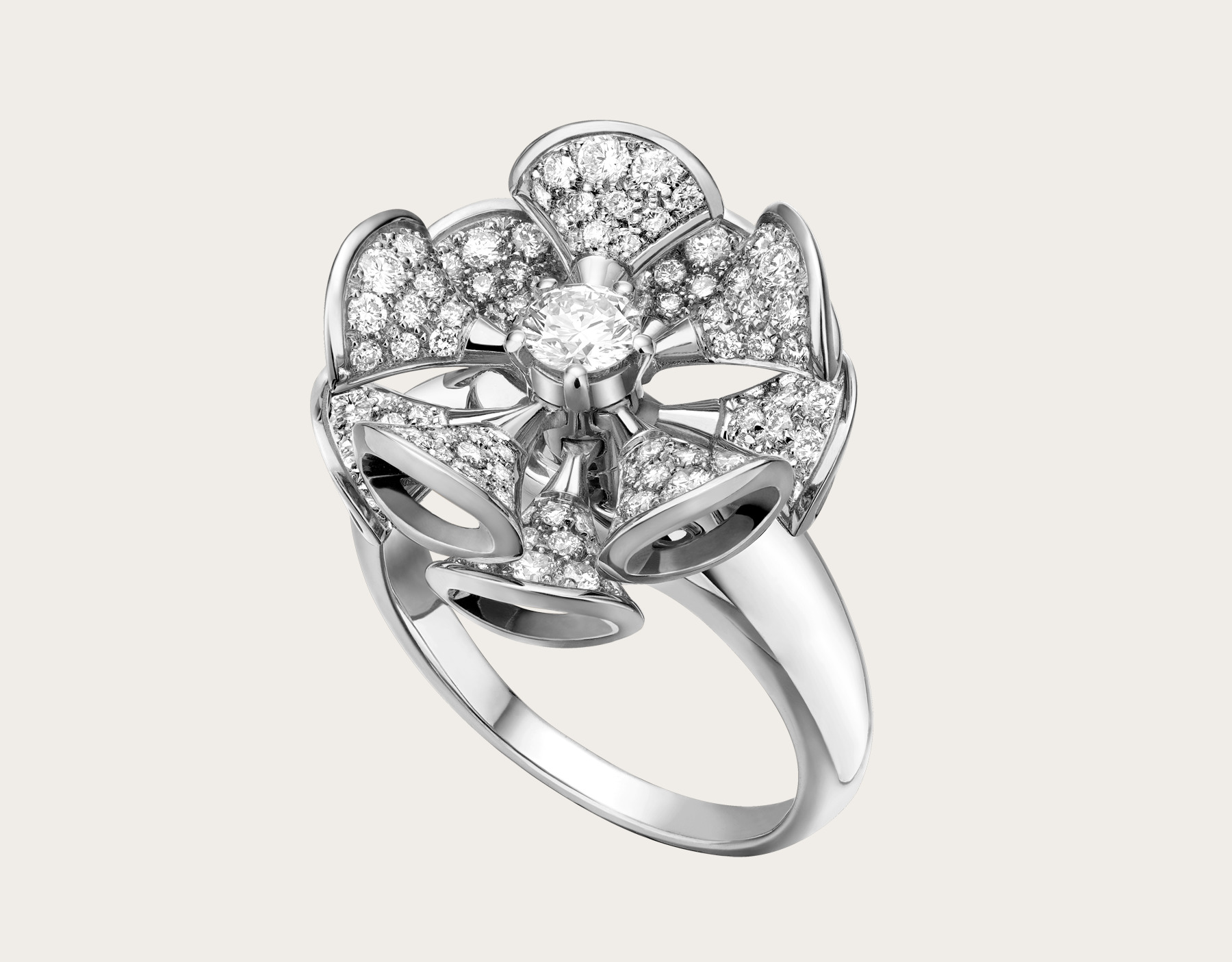 Reflection of the favorite brand of naturalistic motifs. The combinations of stones of various shades and shapes on elegant rings resemble lush and beautiful bouquets of flowers. Mostly pear-shaped stones are used, which imitate individual petals on flowers topped with a diamond core.