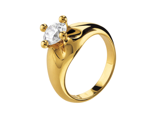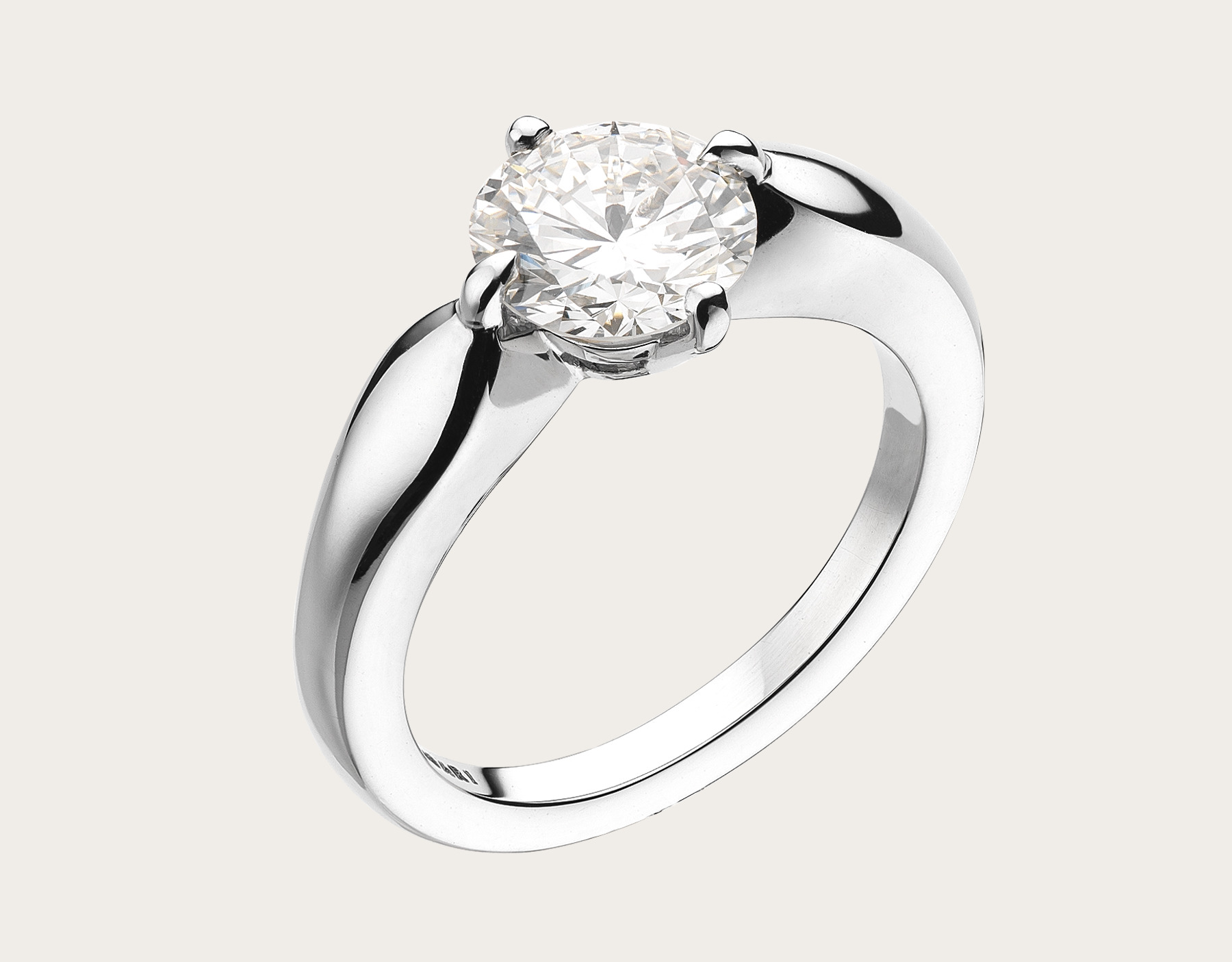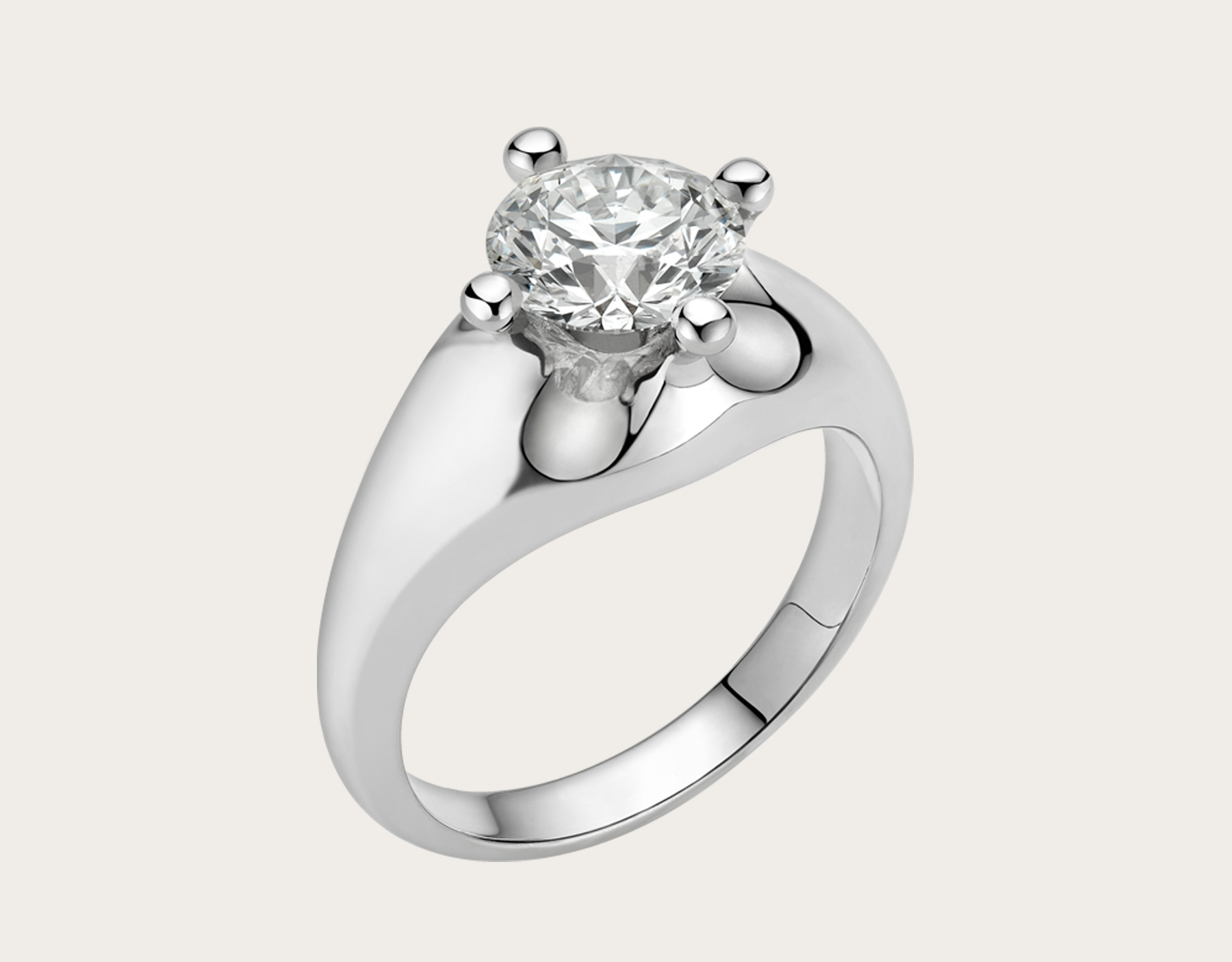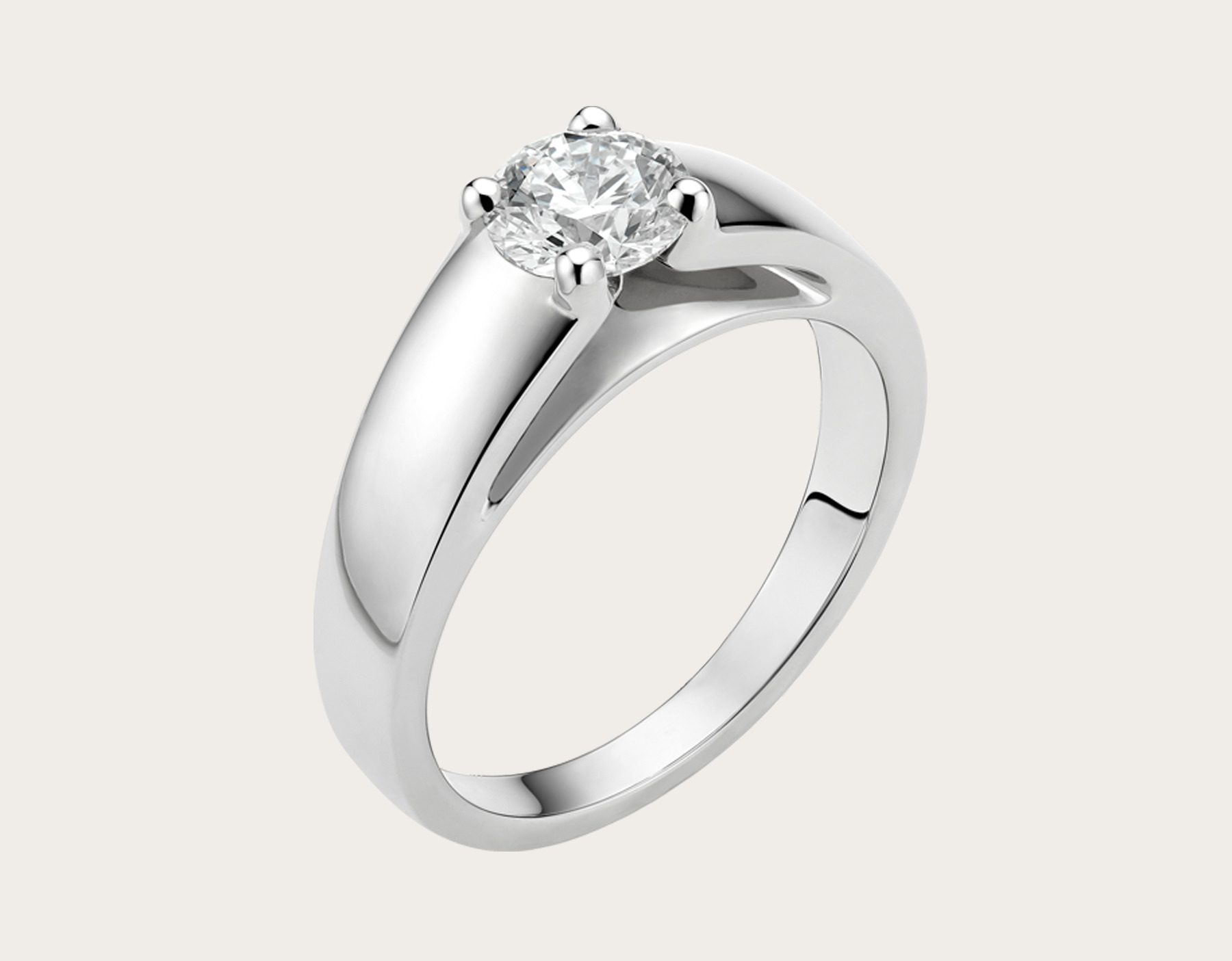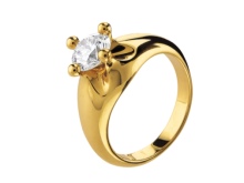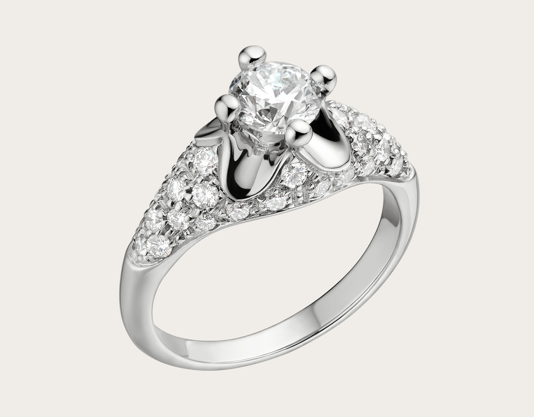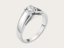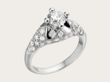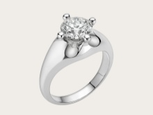 A laconic design dominated by stately platinum. In the center of the rim on tiny paws a volumetric solitary diamond is fastened. One of the most popular collections preferred by romantic brides.