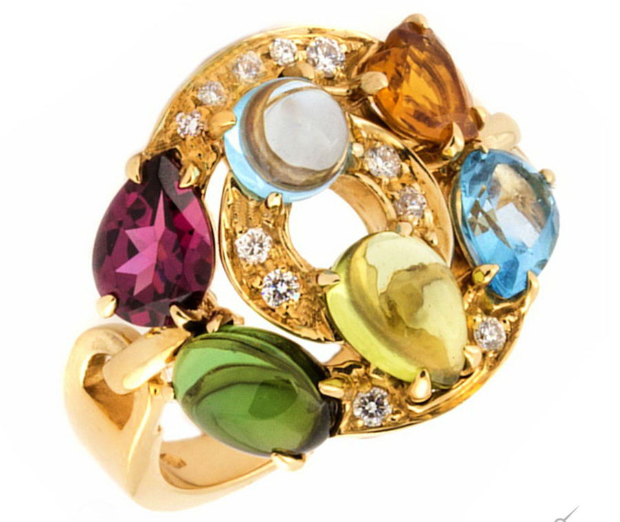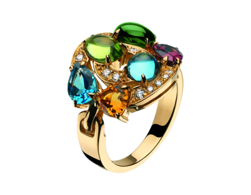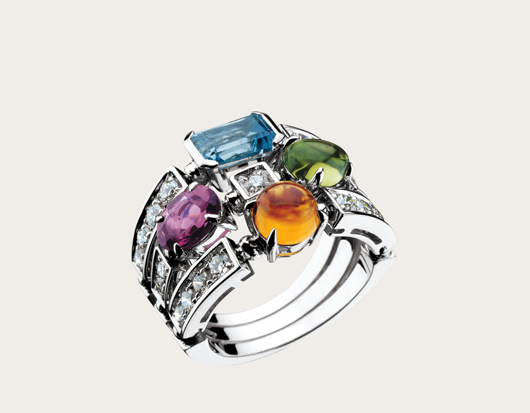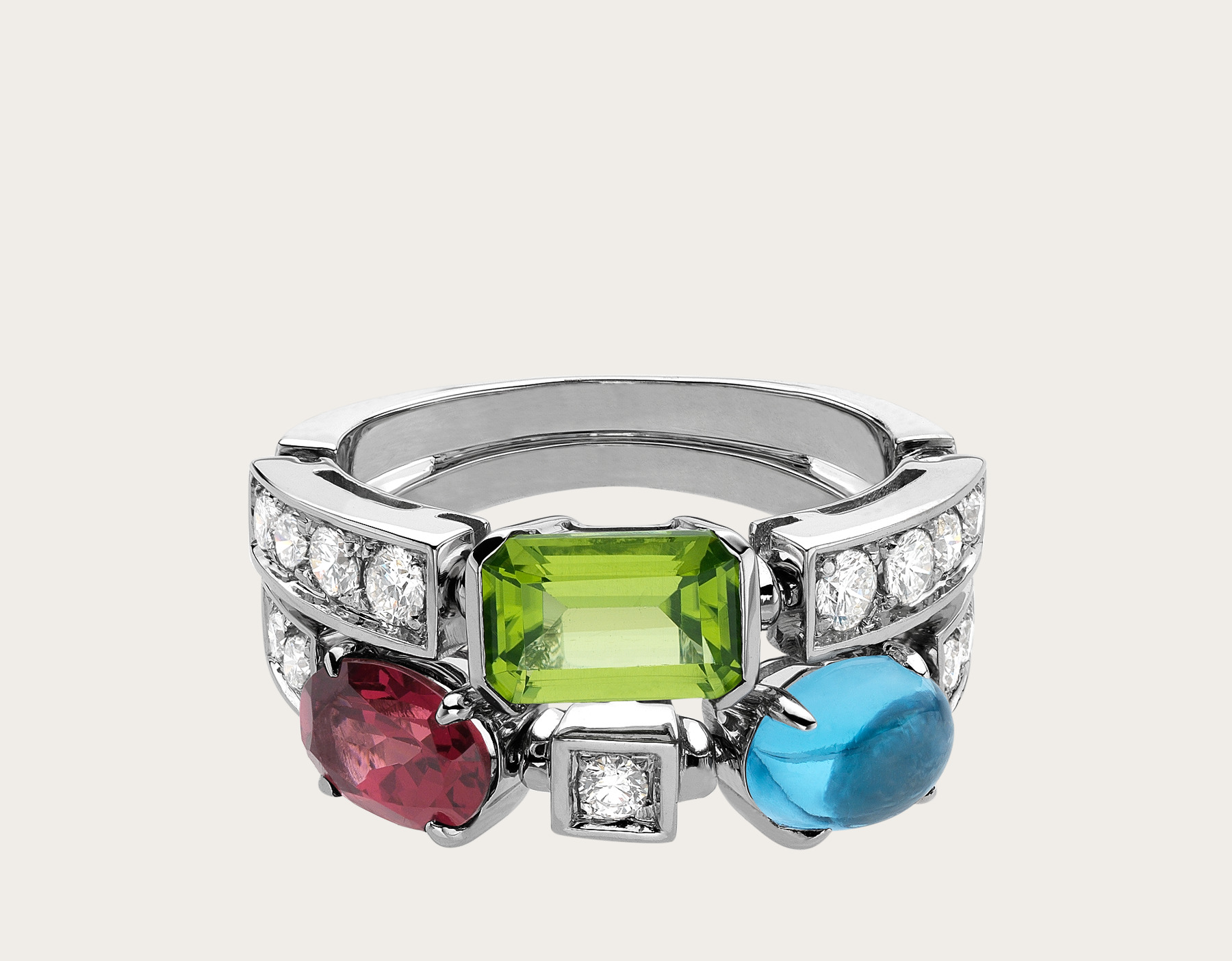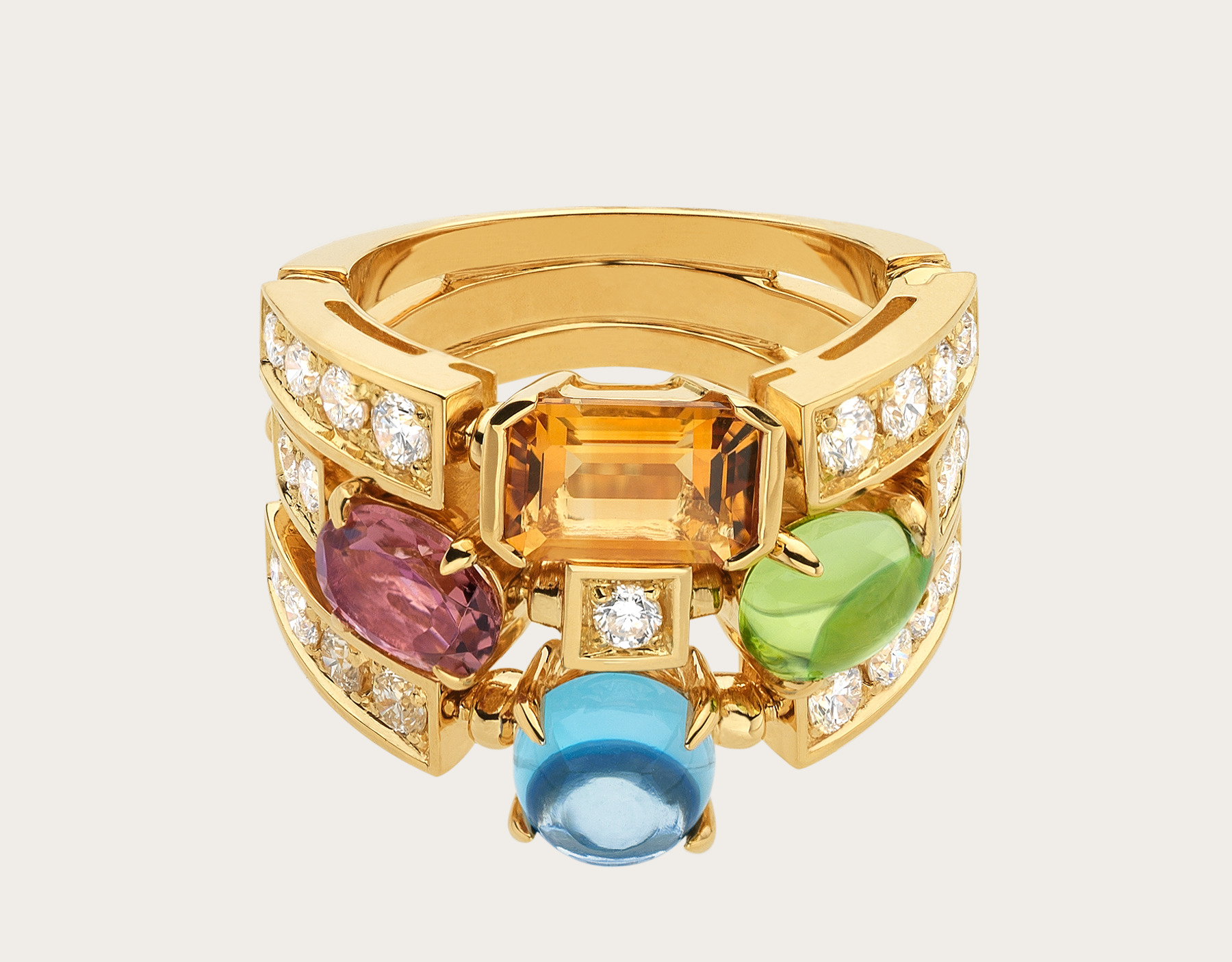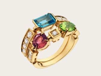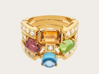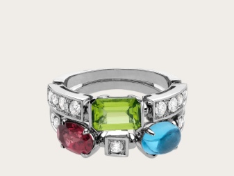 The real incarnation of the free spirit of Bvlgari is an incredibly bright and rich collection of bold color solutions. Two and three-row products of predominantly white and sometimes yellow gold accompanied by multi-colored stones towering on the rim - peridots, citrines, blue topazes, pink tourmalines.