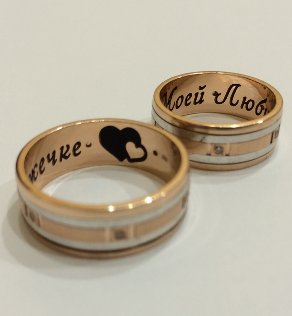 - the faces of the inscriptions or drawings, obtained by the diamond engraving method, reflect light in their own way, which allows the spouses to have unique shiny rings.