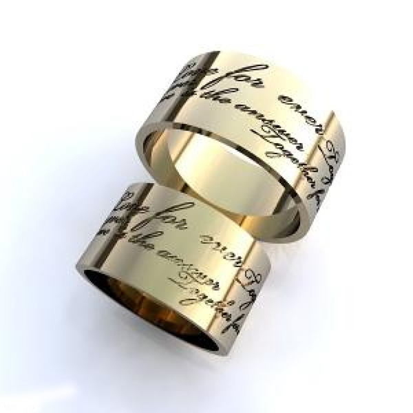 If the quotation is rather long, then it can be divided. The first part of the phrase is engraved on the female adornment, and the second - on the male. This idea is perfect for pair rings.
