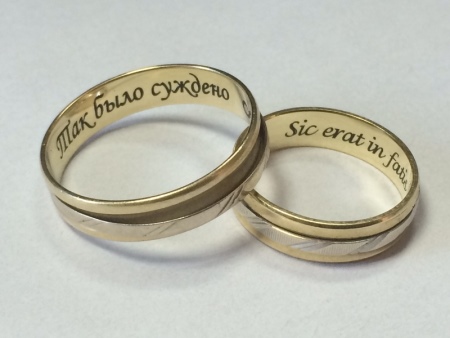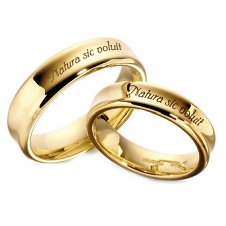 Most often for the bride and groom engraved on the rings their names or the date of marriage. Also popular is the idea when paired jewelry is applied in half of any expression. You can use ready-made examples of phrases applied to wedding rings.