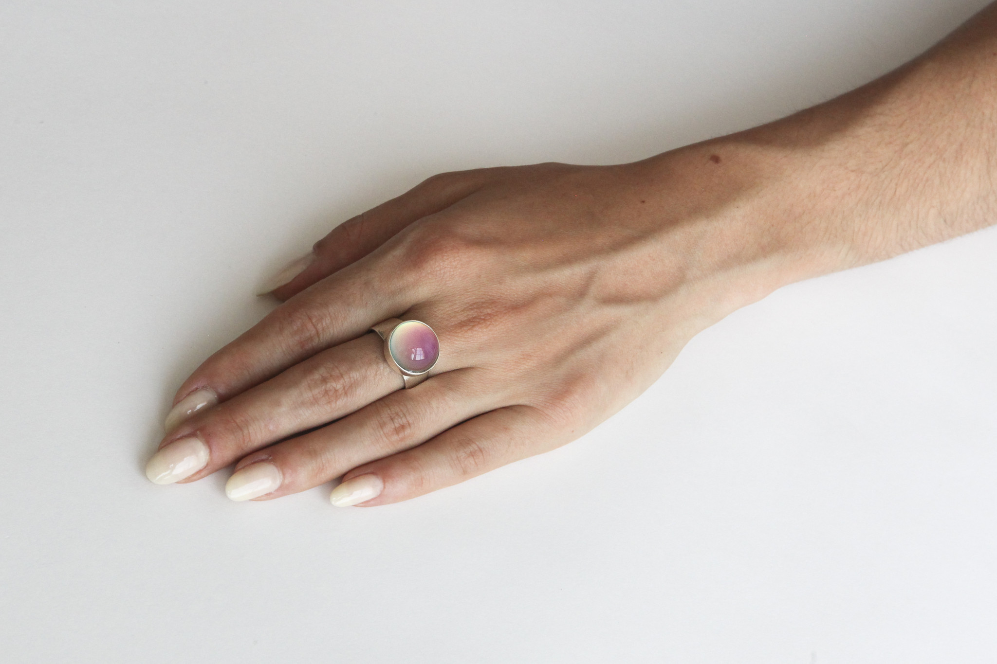 Everyone, without exception, it is interesting to observe the incredible changes in the shades of the ring. Even if it doesn’t change the tone on the finger for a long time, you can remove it and experiment by putting the ring on cold or warm surfaces.