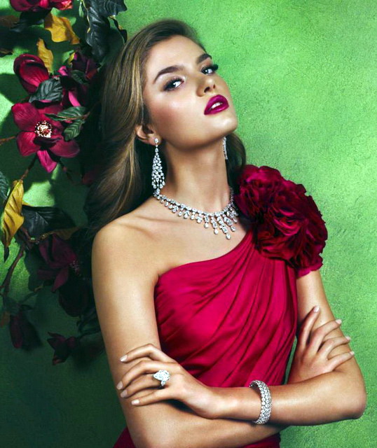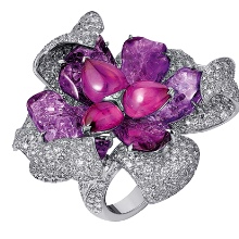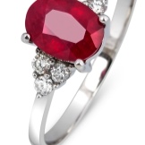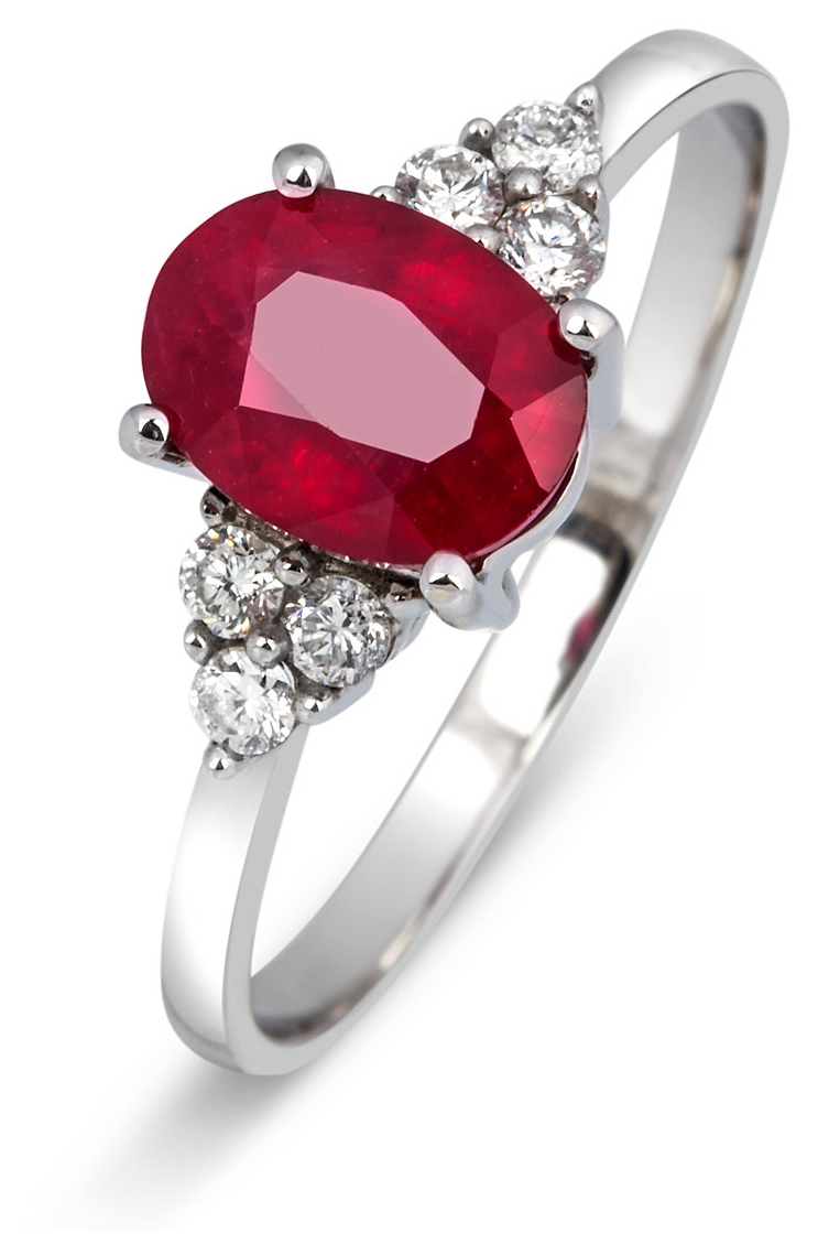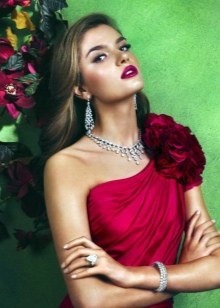 The ruby is combined with a diamond as effectively. This juicy stone looks contrast against the background of light decorations, attracting attention.