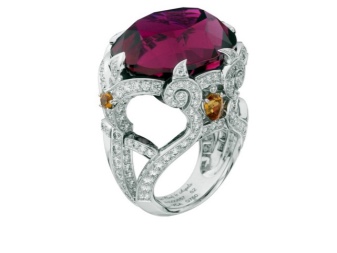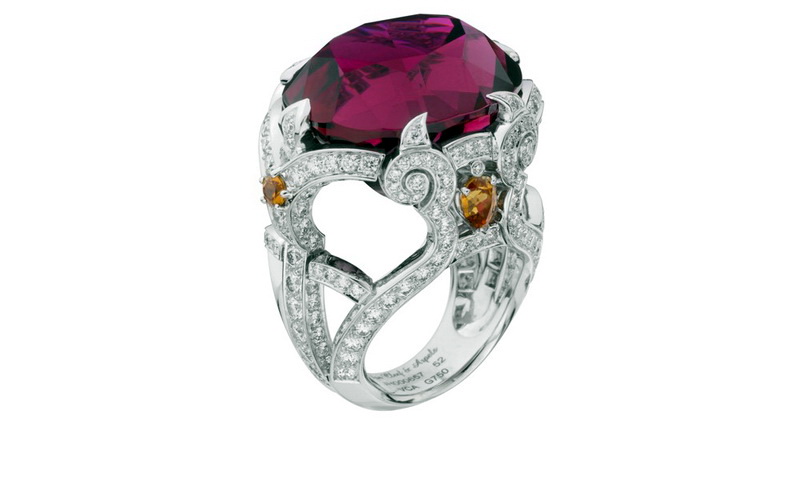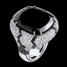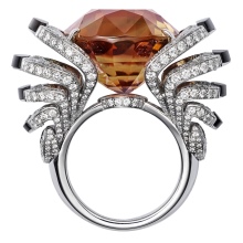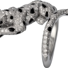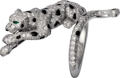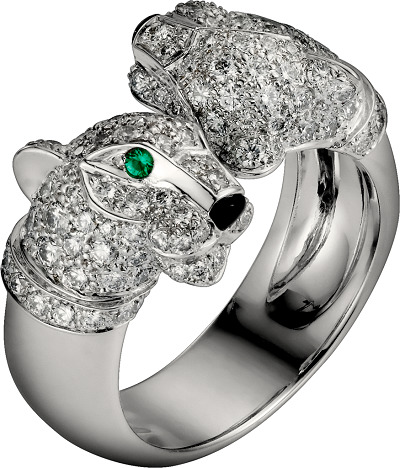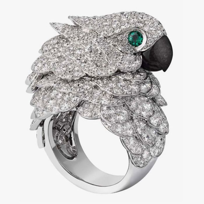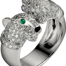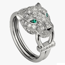 The business card of the Cartier brand is a combination of emerald, onyx and diamonds in white gold. Green gem is most often used to decorate the eyes of animals, in the form of which rings are made. Such bright eyes attract the attention of others and harmoniously look surrounded by placers of diamonds.