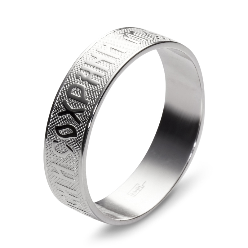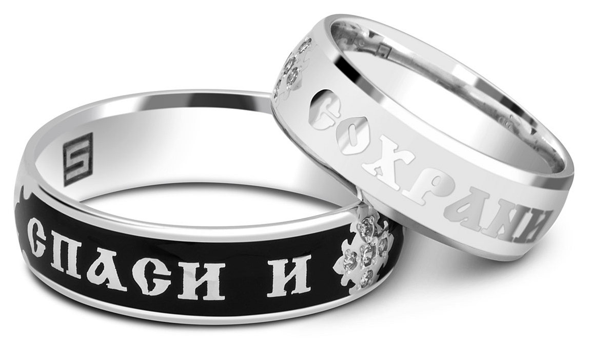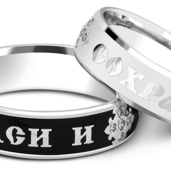 Popular today and rings with religious symbolism. These include items "Save and Save." Similar pieces of white gold look especially light and harmonious. They can be supplemented by Orthodox prayer on the inside or outside. Jewelers often complement such accessories with dark enamel to highlight the letters on the surface.