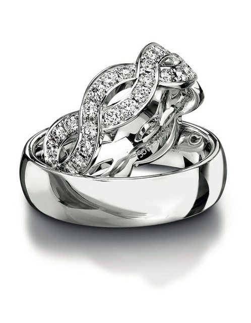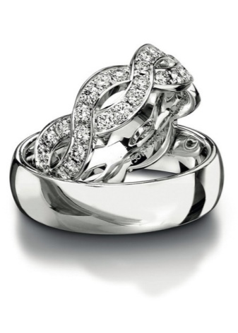 The famous brand Tiffany produces amazing rings with a scattering of diamonds. Precious stones can be made in the form of a track on the surface of the product or be located in different parts of the jewelry. Many couples turn to such models for a wedding ceremony or engagement. Wedding rings of this company are distinguished by their tenderness and brevity.