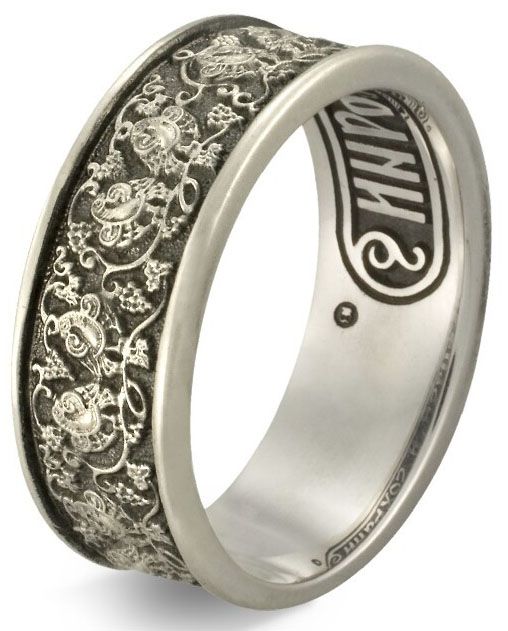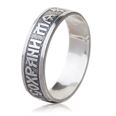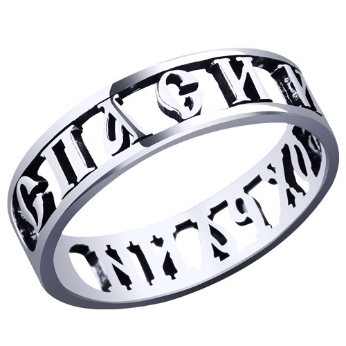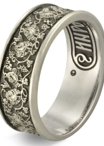 Ring "Save and Save" is usually represented by the same type of design. To draw attention to the engraving, the masters use the darkening of the place under the inscription. Original and unusual look models with slots between the letters. But thanks to elegance and uniqueness, they are more expensive than the usual options.
