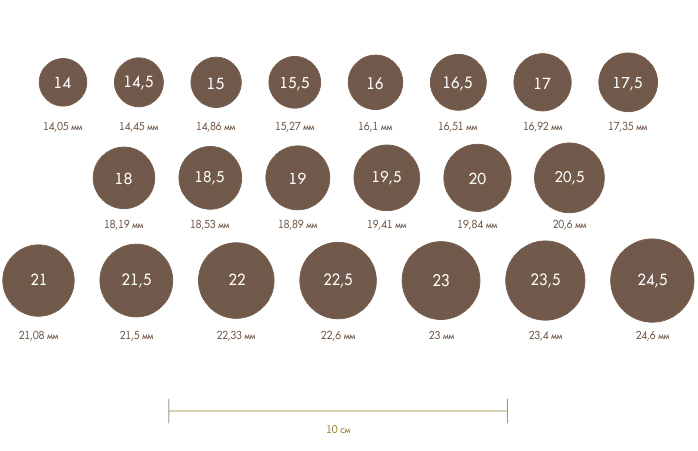 To determine the ring size in Japan, you need to multiply the diameter of the product by 3, and then subtract 38. The same calculation system is common in other eastern countries and South America.