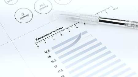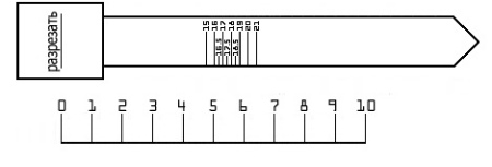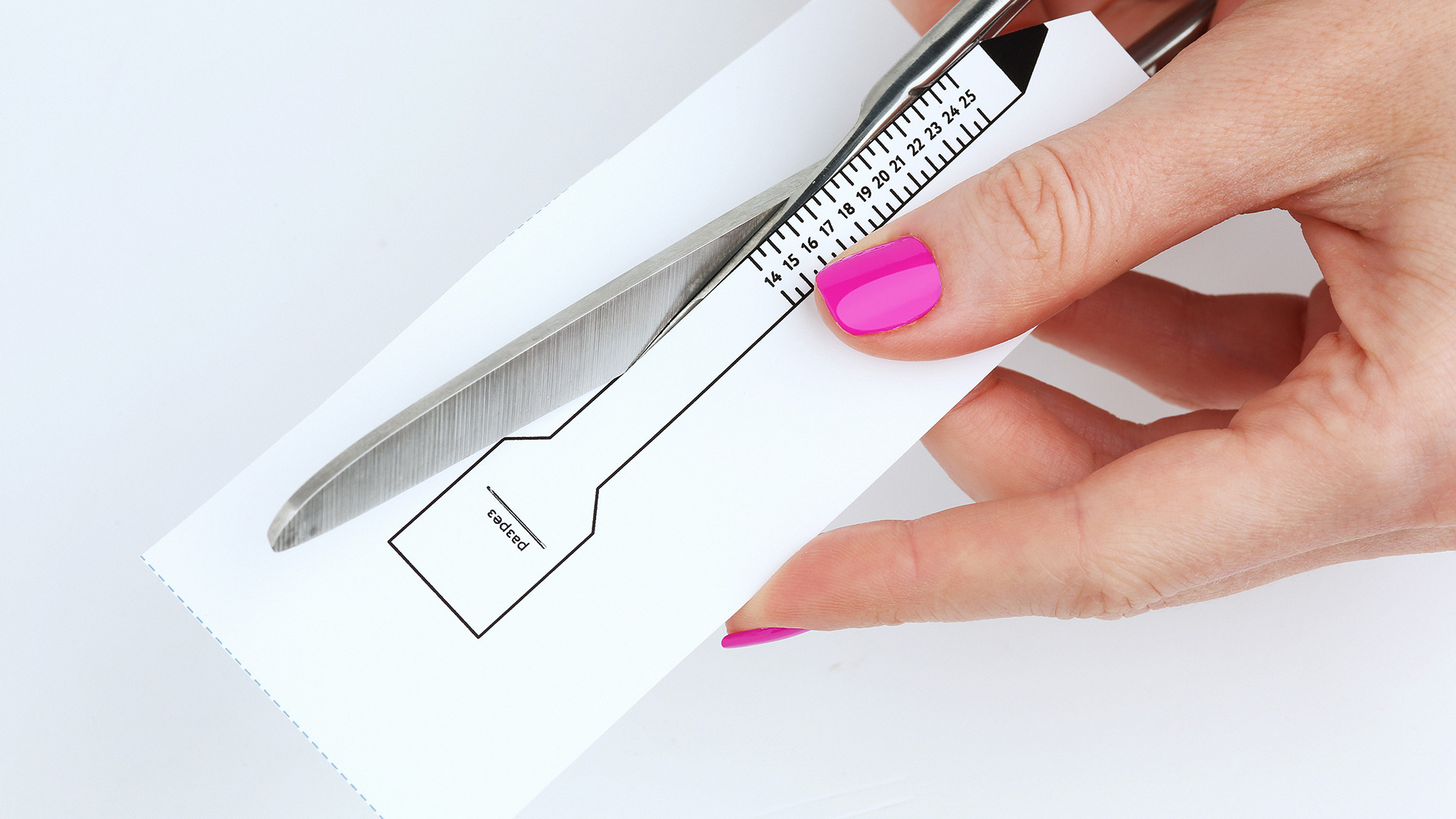 Make a cut along the vertical line on the left. Then insert the pointed end of the strip there, wrapping the “device” around your finger. The scale will indicate the size of the product.