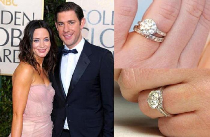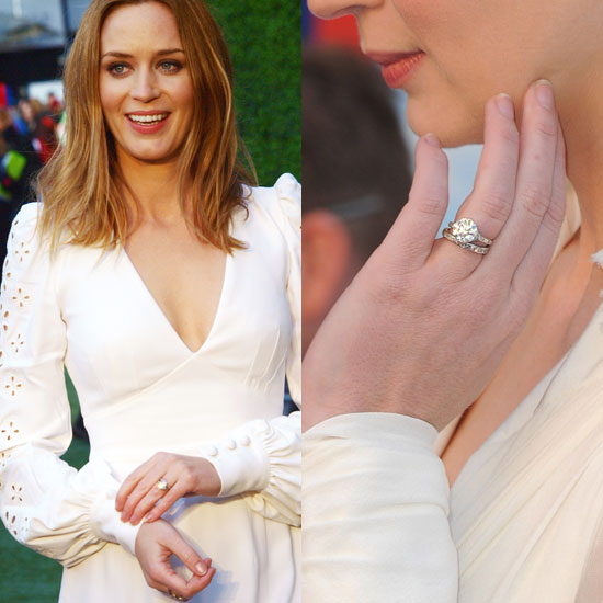 - Emily Blunt is wearing a neat platinum ring with a small but very noticeable diamond on her finger.