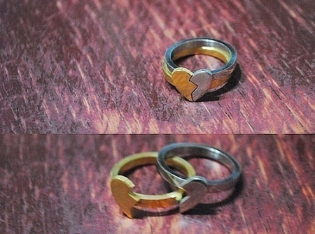 Rings with an element of a kind of puzzle look quite interesting. The male model is decorated with a hole of a certain shape, most often in the shape of a heart, and the female one is decorated with a stone of the appropriate shape and size. If you connect them together, the stone will easily fit into the hole.