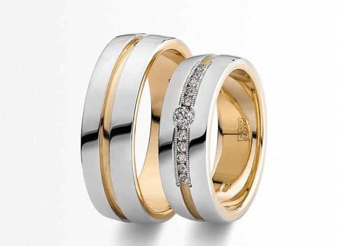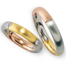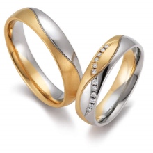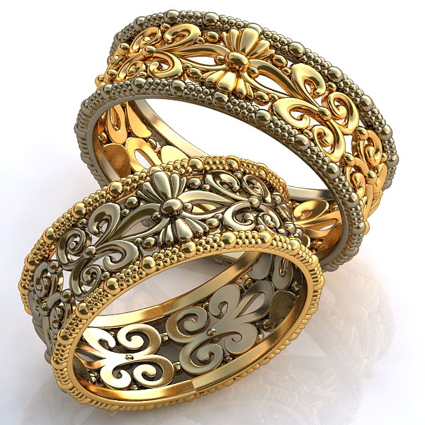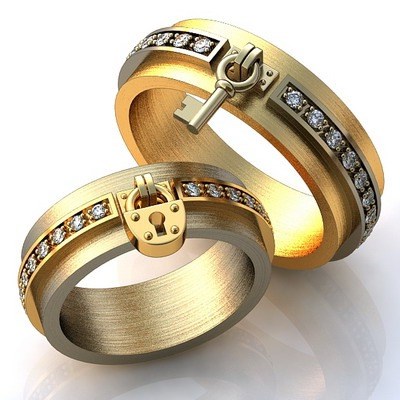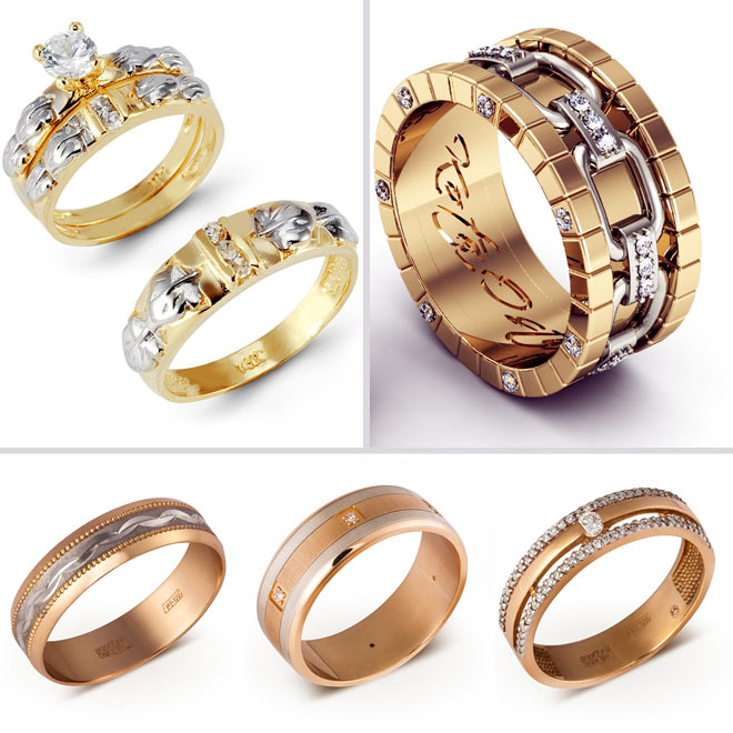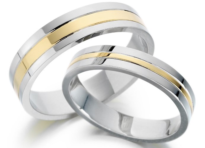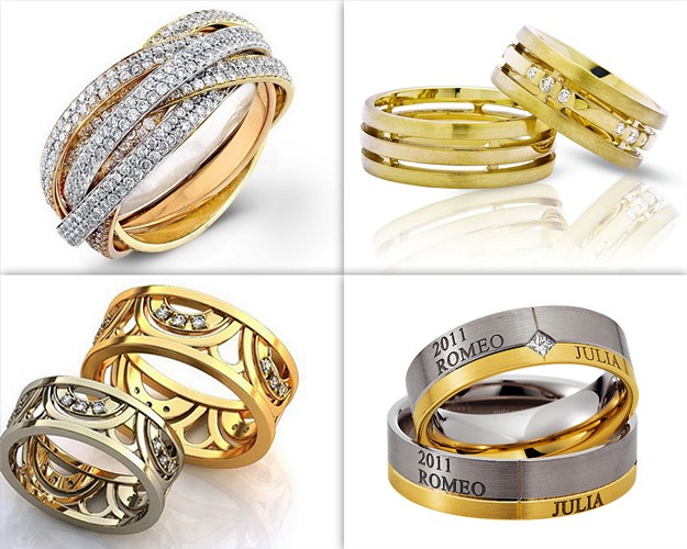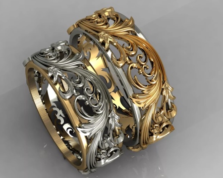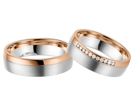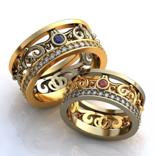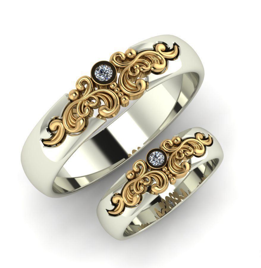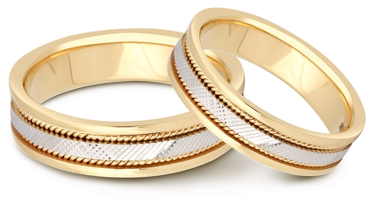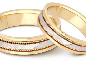 Pair rings, half made from combined gold, for example, white and yellow, or gold and platinum, symbolically represent a harmonious combination of male and female in a married couple. The boundaries between the two types of metal can be smooth, wavy, nodular, or even in the form of a pattern.