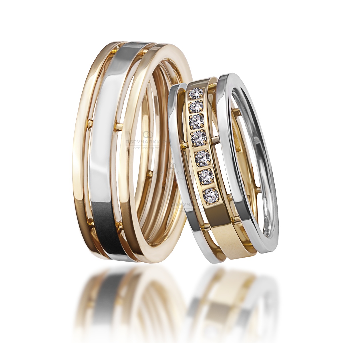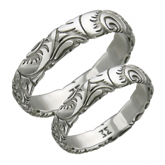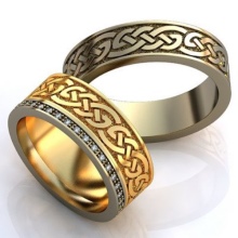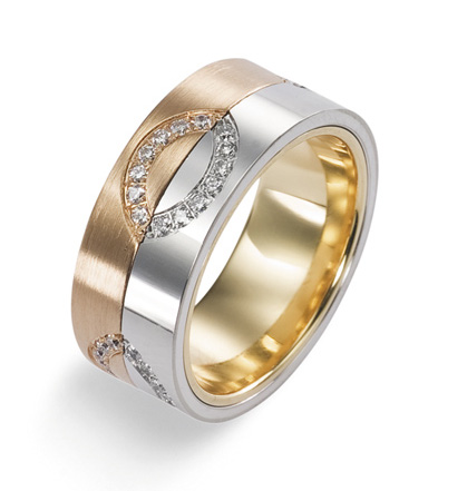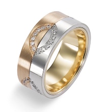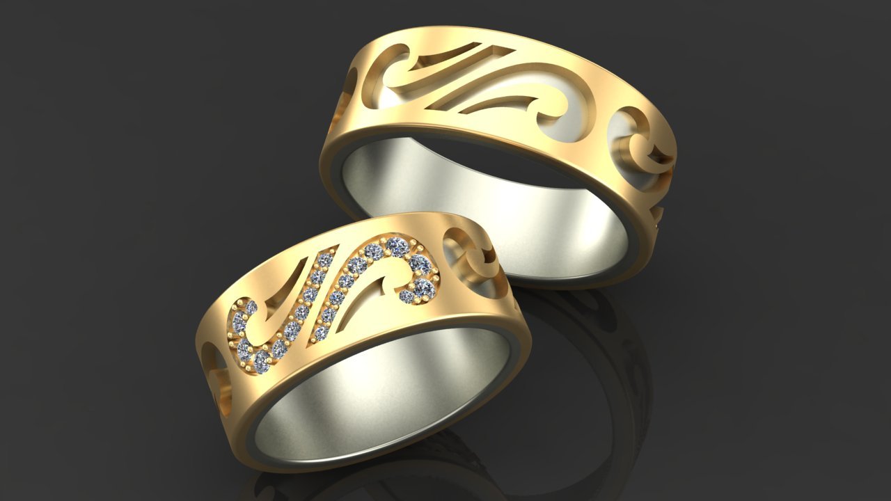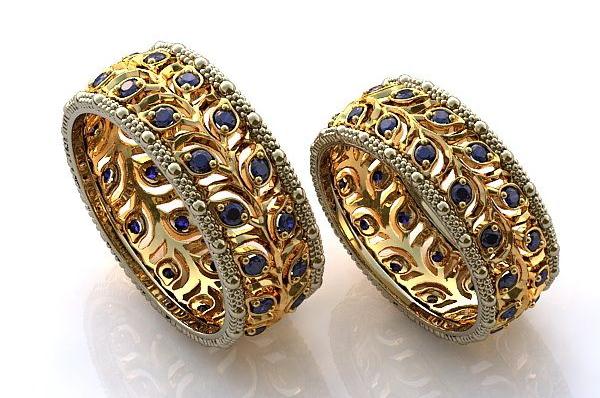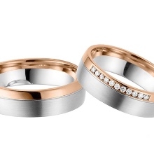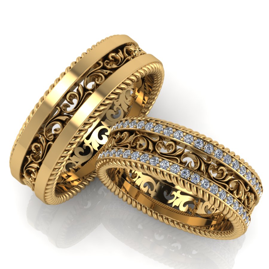 Pair rings, half made from combined gold, for example, white and yellow, or gold and platinum, symbolically represent a harmonious combination of male and female in a married couple. The boundaries between the two types of metal can be smooth, wavy, nodular, or even in the form of a pattern.