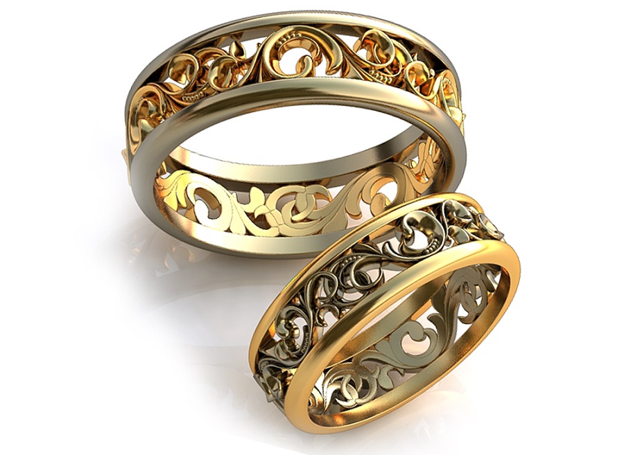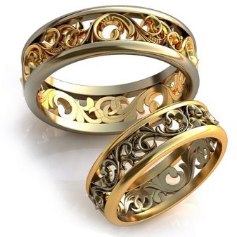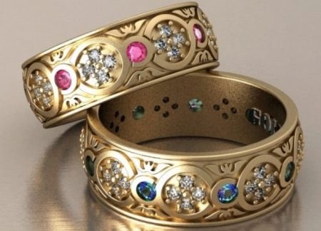 Those products that have openwork inserts, small colored pebbles and embossed patterns look especially bright and attractive. Ladies copies have a more elegant and feminine design. Male rings are wider and larger.