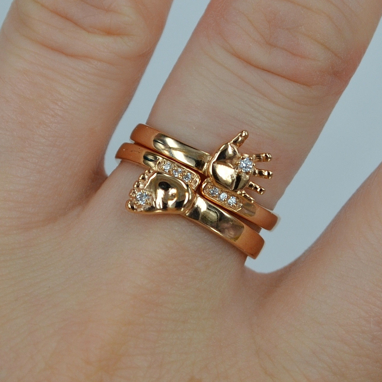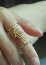 There are also combined models. For example, one little ring can combine both a leg and a child’s handle, pointing fingers in different directions. Two small figures are separated by a rim of a spiral ring and create the effect of the so-called triple ring.