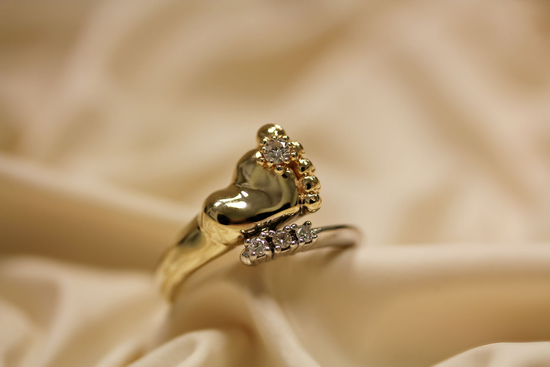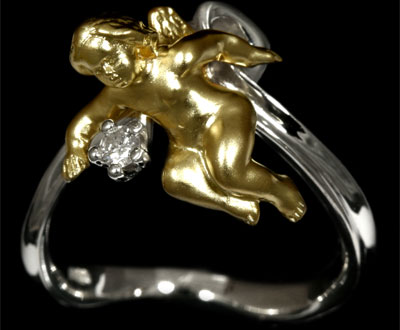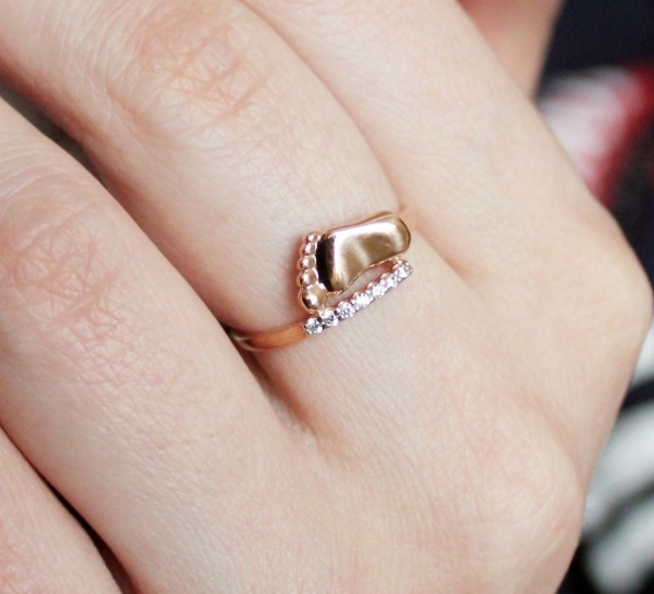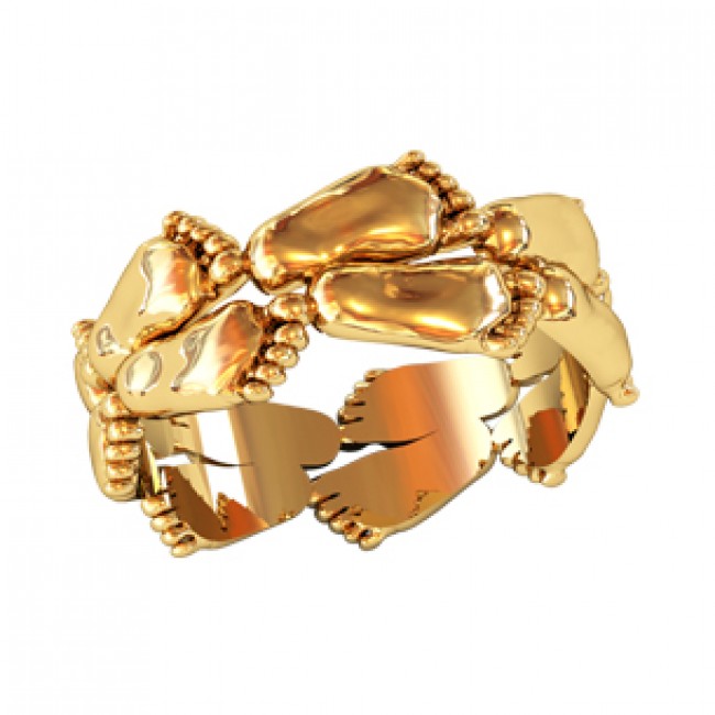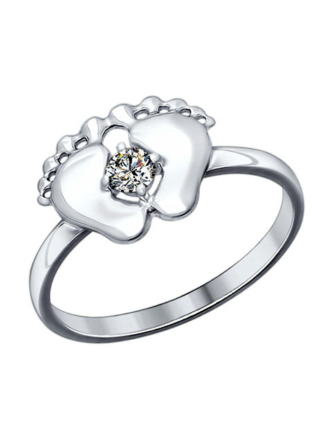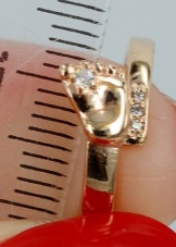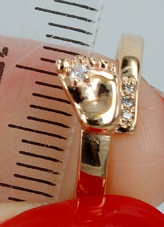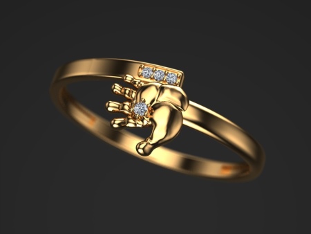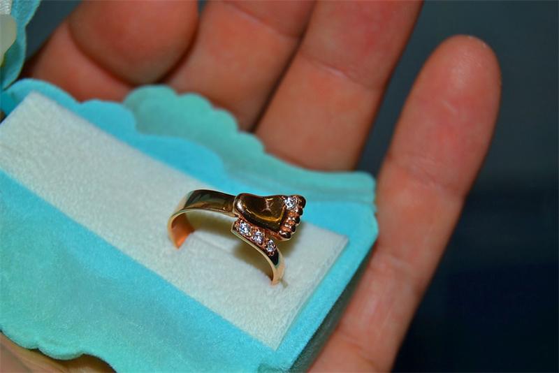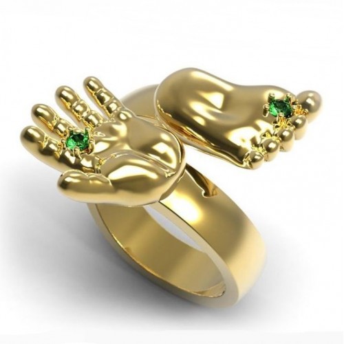 A jewel with a baby's foot means that the baby born in the future will leave its mark on the world. Such a model of a ringlet can be decorated with cubic zirconias, and one of the pebbles is usually located between the large and medium toes of the foot.