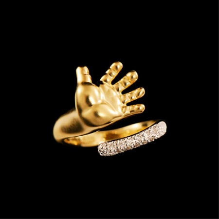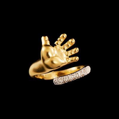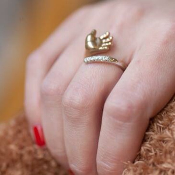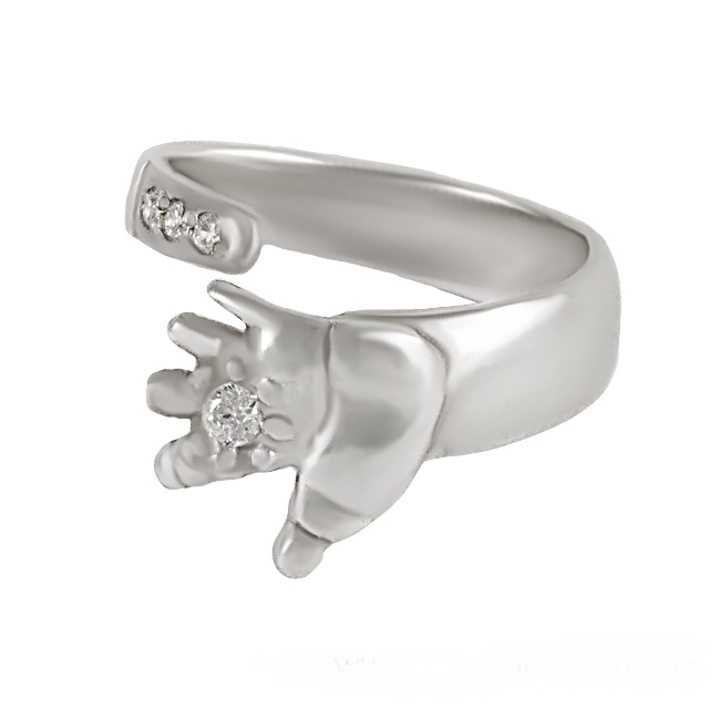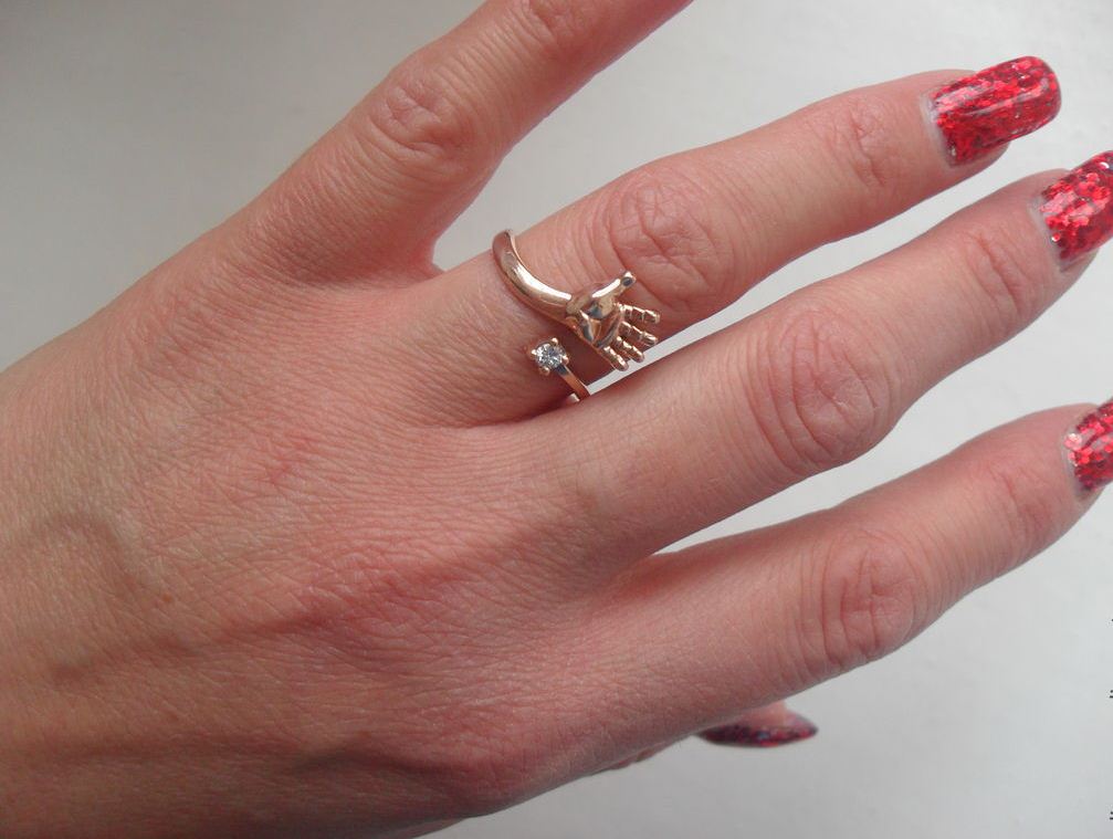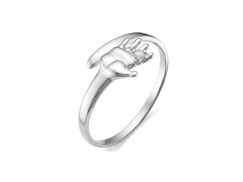 A jewel with a metal children's palm looks no less cute and touching. It looks very nice ring, the rim of which is studded with small iridescent crystals.