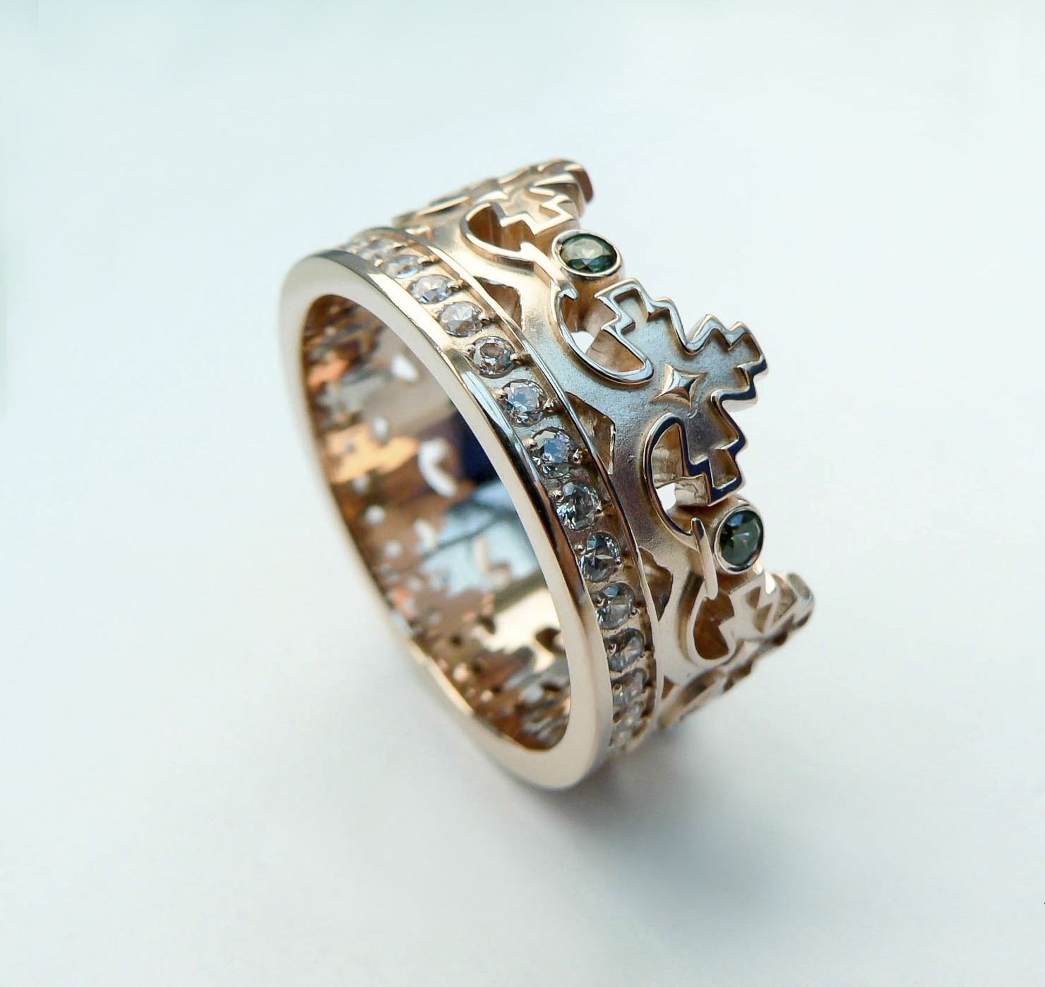 As you know, every girl wants to feel like a princess. When she enters a time of motherhood, she becomes a queen. Jewelry with a design in the form of a crown will look on the finger very elegant and delicate. A gift from her husband, it will tell the expectant mother about its importance in his life, and also hints that he is looking forward to the birth of his heir.