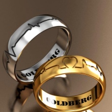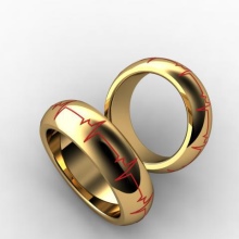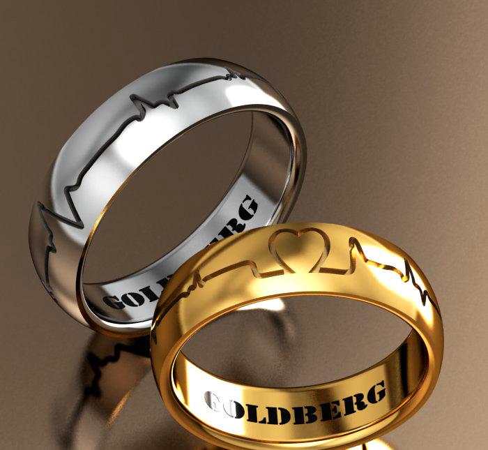 A rather unusual solution is that a copy of a part of the groom's cardiogram is applied to the product. Thus, it shows that a man gives his heart to his beloved. Sound waves can be engraved on a smooth metal surface. Some couples turn to craftsmen to make a ring with a through pattern.