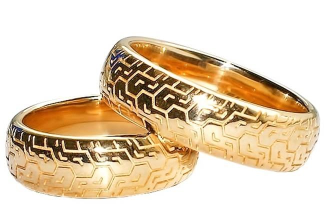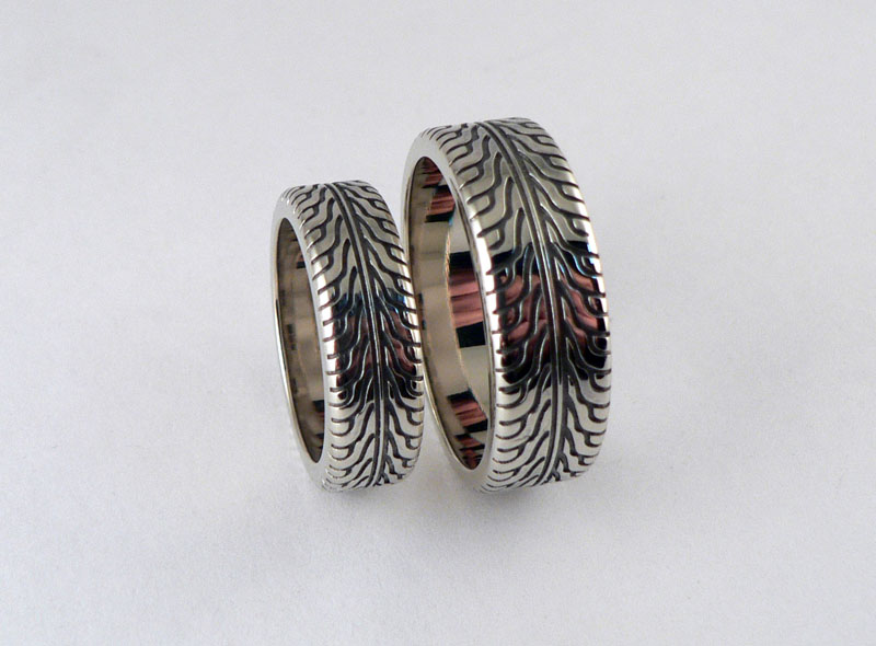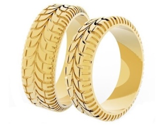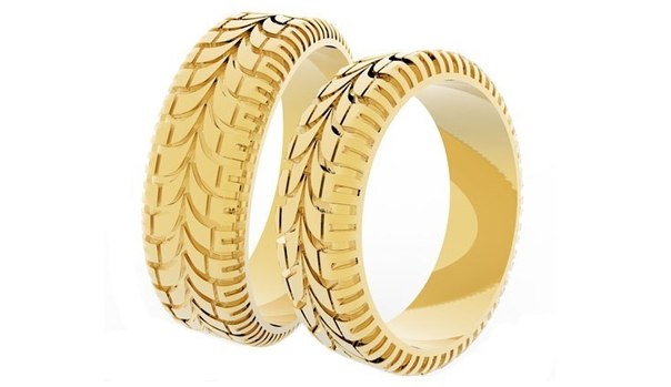Fans of automotive subjects will love the rings with the tire tread pattern. On a finger, items in the form of tires or motorcycle wheels look very original. This is a great solution for couples who met in a road setting, while traveling or visiting races.