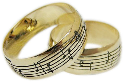 The product looks beautiful if the pattern in the form of notes is made of enamel. Such a wedding jewel should be ordered from the best masters of their craft.