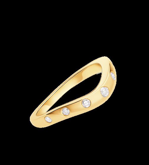 - A variant with a wave-shaped rim framed by diamonds, which are not located next to each other, but at a great distance. Seven diamonds are embedded in metal, as a result of which the model looks quite unusual. Materials - platinum and yellow gold.