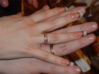 So rings no longer need any jewelry in the form of a stone. They themselves look like finished and expensive jewelry. Often, to emphasize the relationship between the bride and groom, the master performs drawings that have a common similarity.