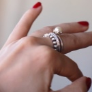 A great design solution - a Pandora ring with a Kerry diamond. It is made in the form of a chain of small balls connected closely together, carelessly twisted around a finger in six turns. The product is complemented with 0.03 carat diamonds. The owners of such a ring are incredibly lucky, because the model has already been discontinued.