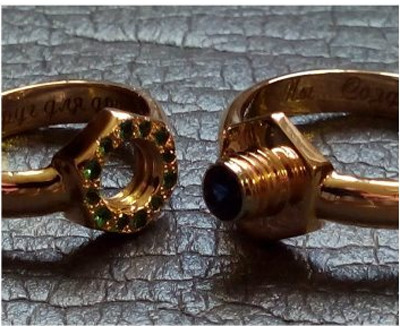 Models with 3D-images, perhaps the most spectacular and bold type of decor. Paired rings such as "Bolt and Nut" or "Key and lock" fit together in size and diameter and can be combined like a mosaic. Some 3D images or inscriptions are located on the inside of the ring. By pressing in, they leave a fingerprint of a picture or a word on the skin of a finger.