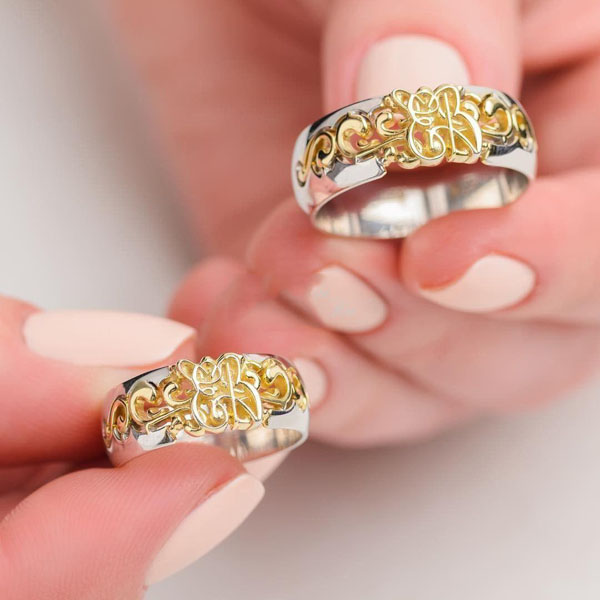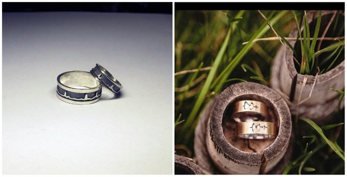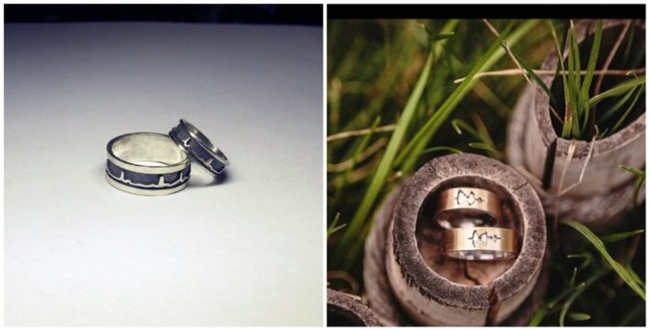One of the most romantic jewelry for the bride and groom is jewelry with an engraved cardiogram, symbolizing the beating of two hearts in love. It is also impossible not to focus on the engraving in the form of notes, symbolizing the melody of love.
