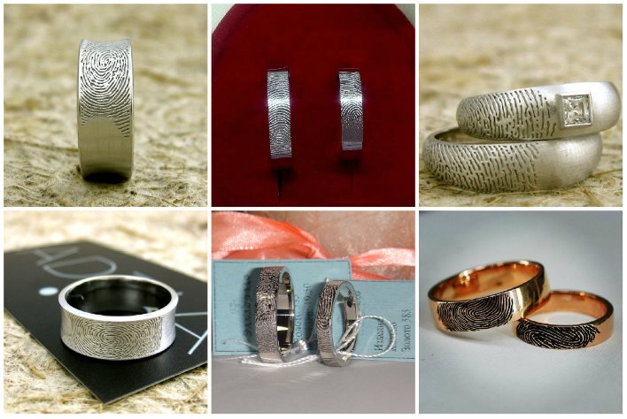 The original design will emphasize the sophistication of the bride and the manliness of the groom. A very unusual model of paired rings - with a fingerprint. The imprint can be applied both inside and outside the product. Also, this kind of decoration of the ring is created over its entire surface for even greater glamor.