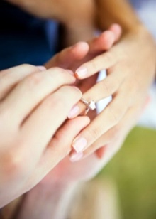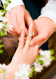When a young lady gives a positive response to the offer of her lover to become his wife, she puts on a ring that was presented to her for the future place of the wedding ring and wears it right up to the wedding. On the solemn day, when the girl finally puts on her wedding dress, she should remove all the jewelry from her hands. When the marriage ceremony took place, and the bride and groom exchanged wedding rings, they officially became husband and wife.
