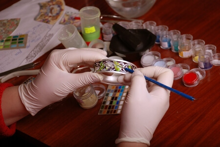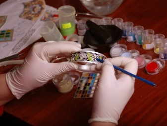 - The second way is that the enamel itself is first made, it should be bright. Make it from a colorless varnish and a color pigment. Special recesses are made in the decoration, after which this composition is poured into them. The more layers, the brighter the coating will be. After this, the products are fired according to the technology of the first method to fix the coating.